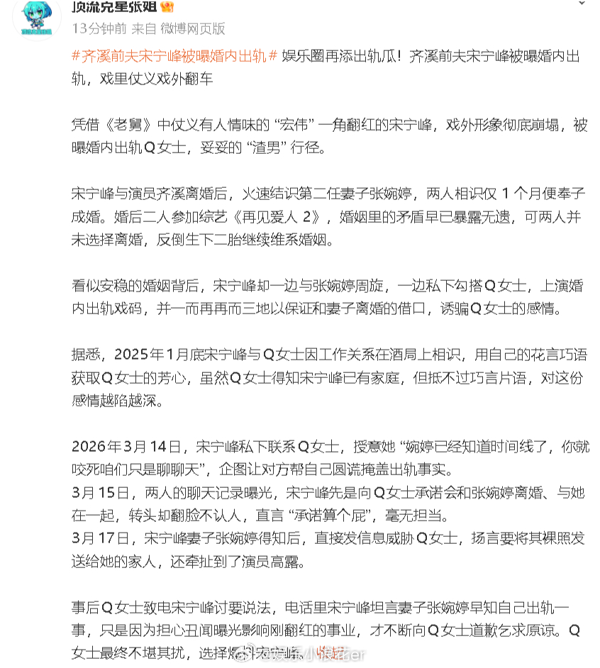 宋宁峰 出轨张婉婷 宋宁峰 八卦媒体曝宋宁峰出轨, 张婉婷用小三裸照威胁,宋宁峰也向Q承诺会离婚。“事后Q女士致电宋宁峰讨要说法,电话里宋宁峰坦言妻子张婉婷早知自己出轨一事,只是因为担心丑闻曝光影响刚翻红的事业,才不断向Q女士道歉乞求原谅。Q女士最终不堪其扰,选择爆料宋宁峰。”小三不堪其扰,选择爆料宋宁峰。