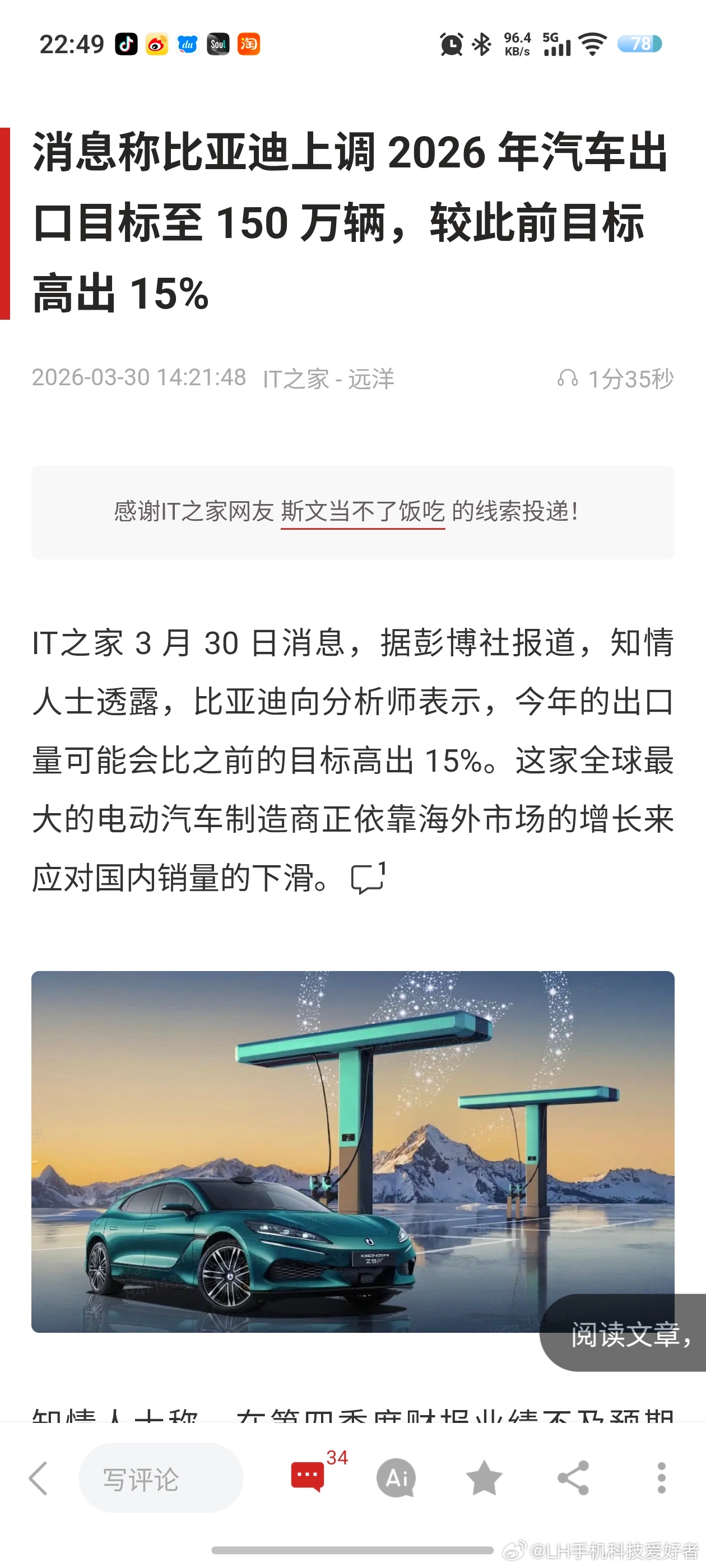 消息称,比亚迪上调了2026年海外出口销量目标,今年设定150万辆。