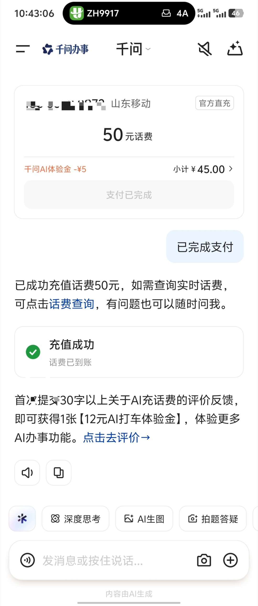 千问又送福利了左上角领取话费卷和打车卷,每天限量100万张,话费卷可以充值50元