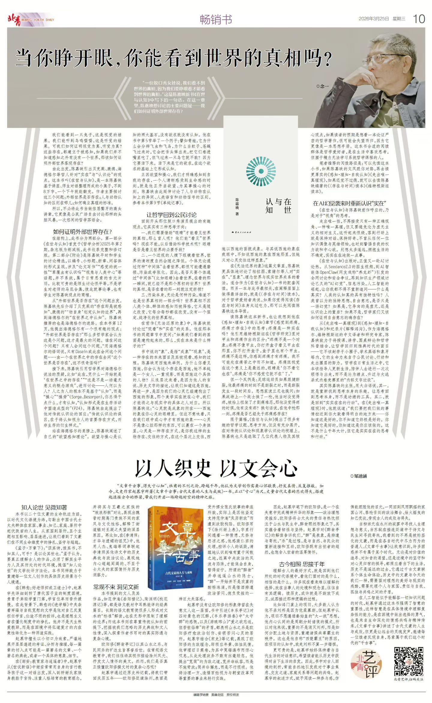 这本书叫《在世与认知》,是一本陈嘉映基于讲座、师生对话整理而成的小集子,不到8万字,一个下午就能翻完。作者主要探讨这三个问题:外部世界是否存在;人与动物认知的区别在哪儿;如何确立真理的标准。所以,不必将此书当做佶屈聱牙的高头讲章,它更像是公民广场自由讨论那样的头脑风暴,一次悠闲的哲学茶话会。如何证明外部世界存在?在结构上,此书分为两部分。第一部分《在世与认知》首发于《哲学分析》2025年第2期,杂志版为删减版,此书收录完整和修订版。第二部分《附论》是陈嘉映平时和学生的讨论精选,以编号、小标题、断章、问答体的形式呈现,涉及“论文写作”、“感觉的统一性”、“草履虫有认识吗”、“视角与人类中心”等话题,并不系统,属于日常思索的吉光片羽。比较可贵的是师生讨论很平等,不是学生对老师的马屁合集,彼此就事论事,也有学生对陈嘉映观点的商榷。从“外部世界是否存在”这个问题出发,陈嘉映先后介绍了贝克莱的“存在即是被感知”、康德的“‘物自身’划定认知的边界”,再到海德格尔的“在世界之中认知”。陈嘉映推荐的也是海德格尔的进路。在本书P12页,他提出海德格尔有一个很有趣的观点:“外部世界是否存在”,那么多哲学家会认为这是个问题,这才是最大的问题。谁在问这个问题?只有人会问这个问题。“用海德格尔的语词说,只有Dasein或此在会问这个问题……由一个在世界之中的存在去问‘这个世界是否存在’,这不很奇怪吗?”接下来,陈嘉映引用哲学界对海德格尔说法的质疑,比如“此在,凭什么一开始就是‘在世界之中的存在’”、“这是不是一场毫无意义的概念游戏”,进而讨论——人何以为人?