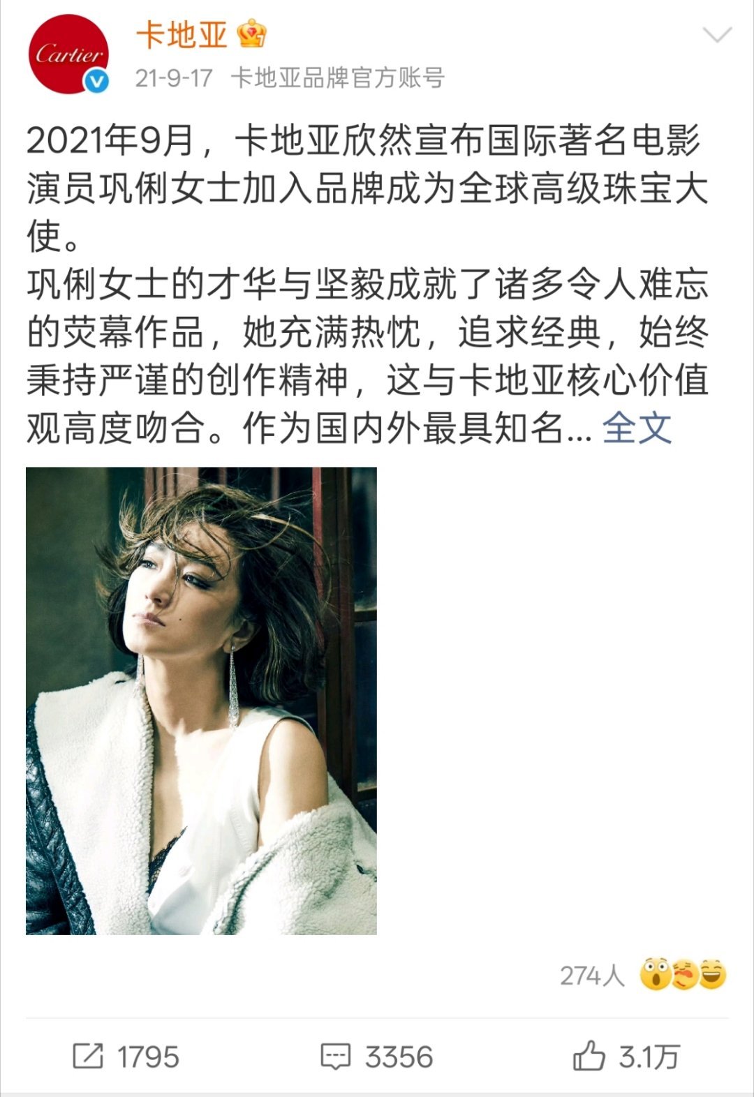 佩戴高珠官宣全球目前只有刘亦菲宝格丽,巩俐卡地亚,章子怡蒂芙尼,分别是品牌在中国最核心代言人。