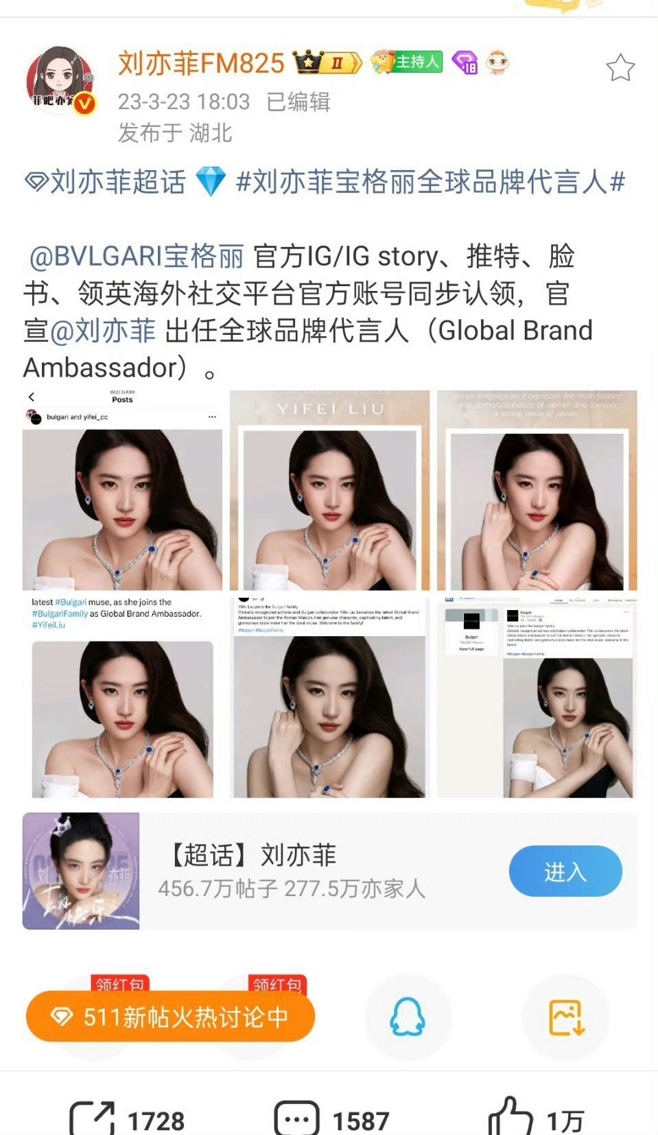 佩戴高珠官宣全球目前只有刘亦菲宝格丽,巩俐卡地亚,章子怡蒂芙尼,分别是品牌在中国