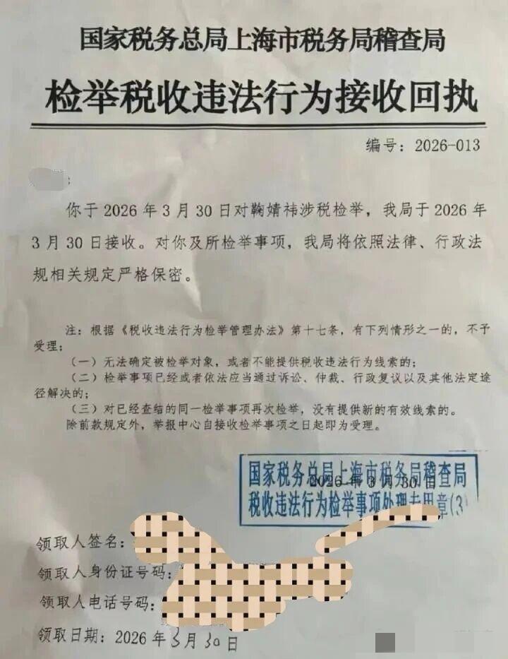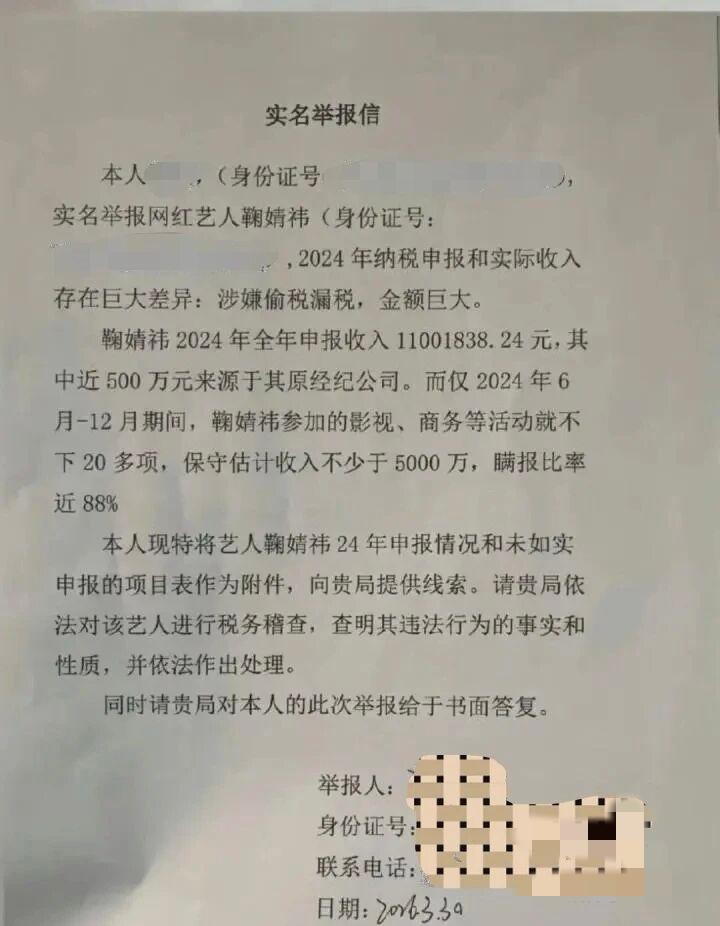 鞠婧祎这次真的危险了!偷税露税再次被举报! 鞠婧祎经纪公司丝芭传媒去年就和鞠婧祎撕过一回,但是后来不知道为什么没有了消息。 今天,有人(大概率是丝芭传媒工作人员)实名向上海税务局稽查局举报鞠婧祎,2024年纳税申报收入和实际收入存在巨大差异涉嫌偷税漏税!而且上海税务局稽查局已经接受了举报! 为什么说是丝芭传媒再次举报,因为举报人提供的鞠婧祎2024年实际收入的每一分钱,都有非常明细的数据,这只有内部人士才会有!所以,这其实就是延续去年的纷争! 如果对方提供的数据没有造假,那么鞠婧祎这次看来非常危险,星途都有可能就此终结!