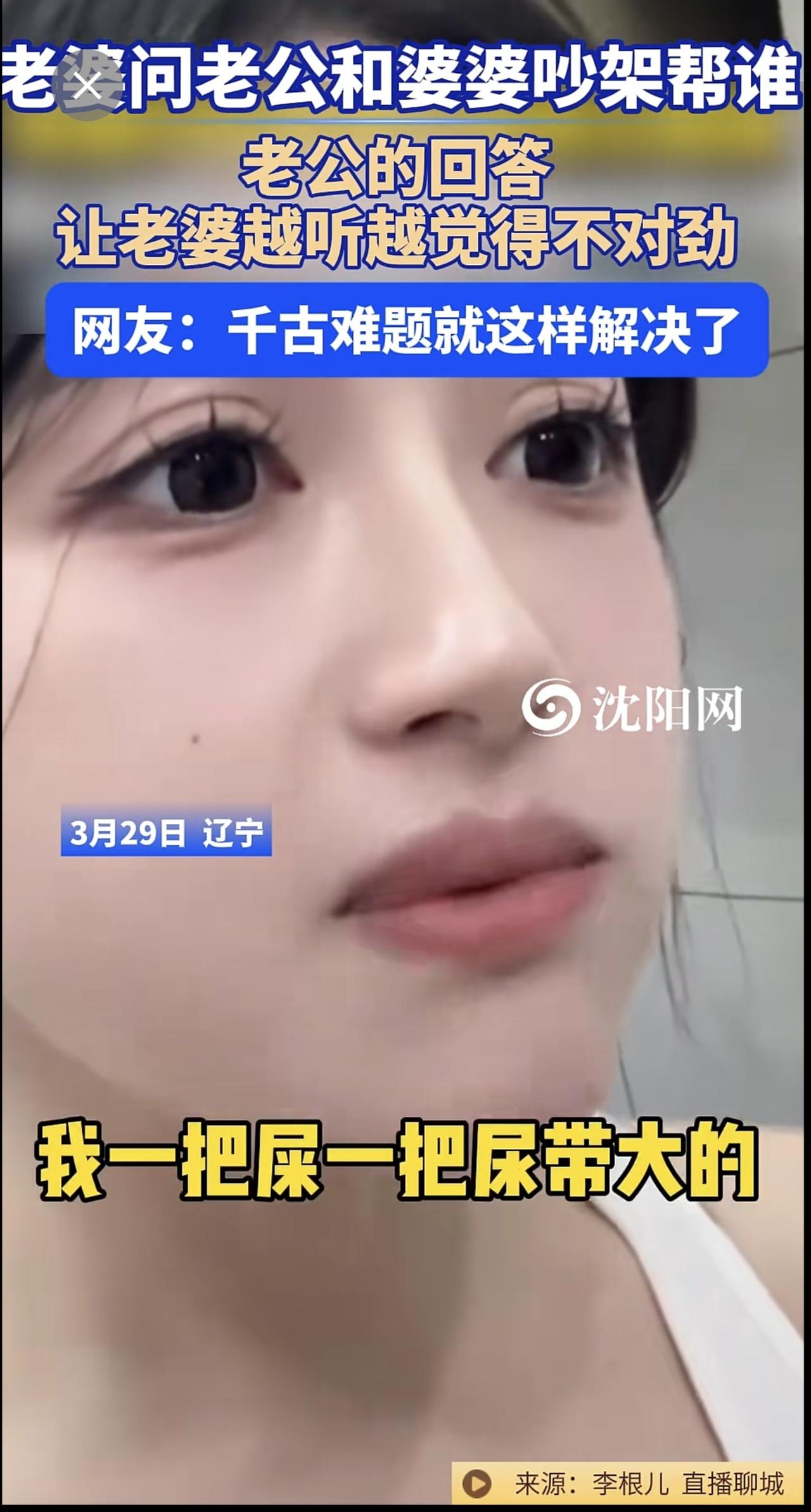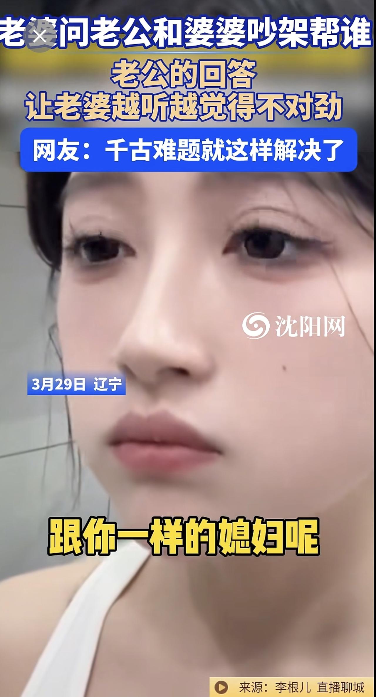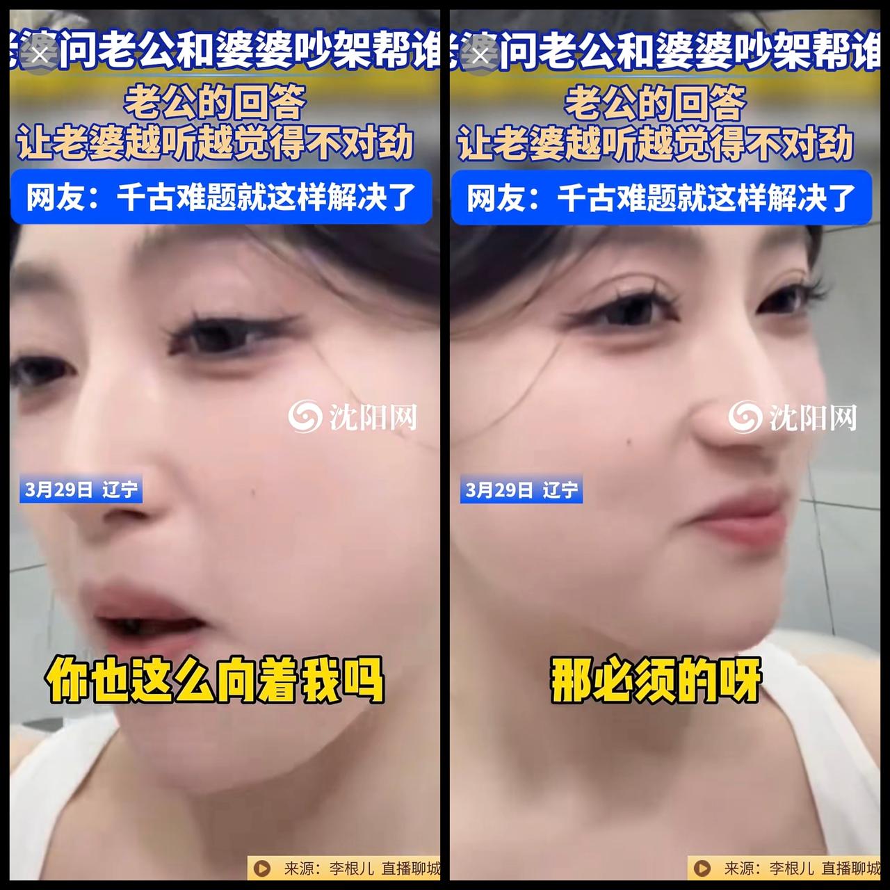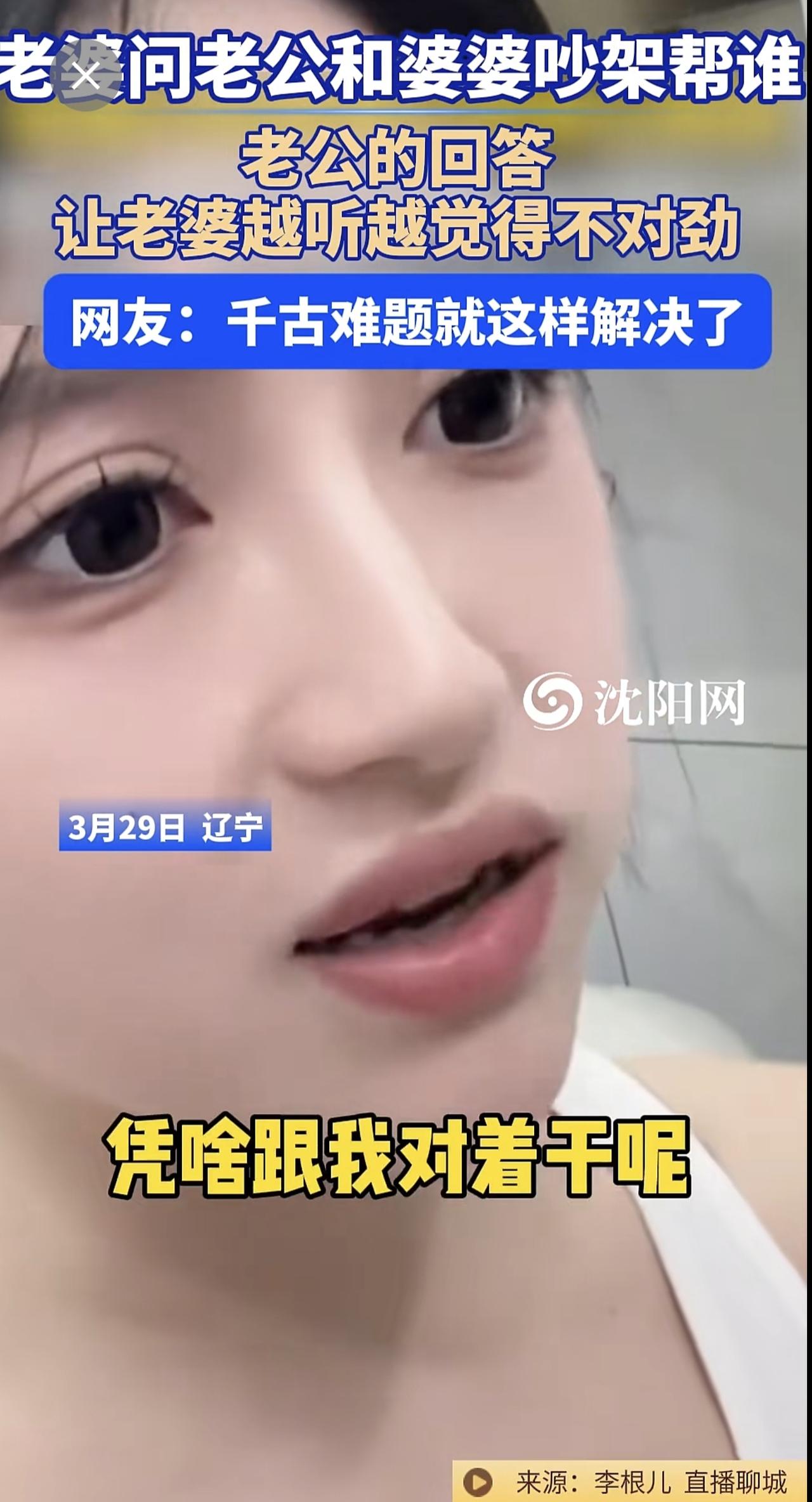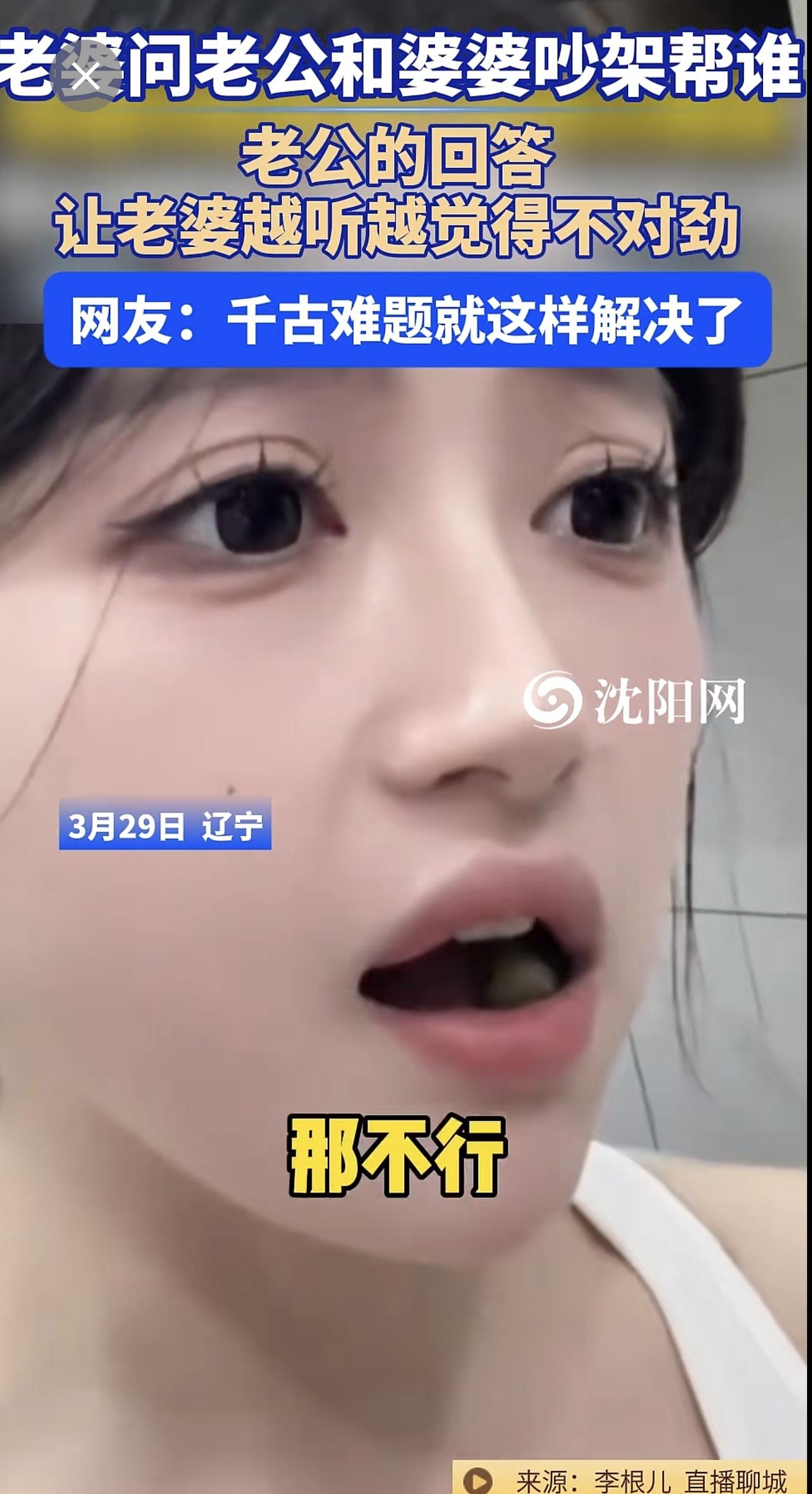 3月29日,辽宁 。老婆问老公和婆婆吵架帮谁?老公的回答让老婆越听越觉得不对劲。网友:千古难题就这样解决了@李根儿33 (编辑:于璐)婆媳