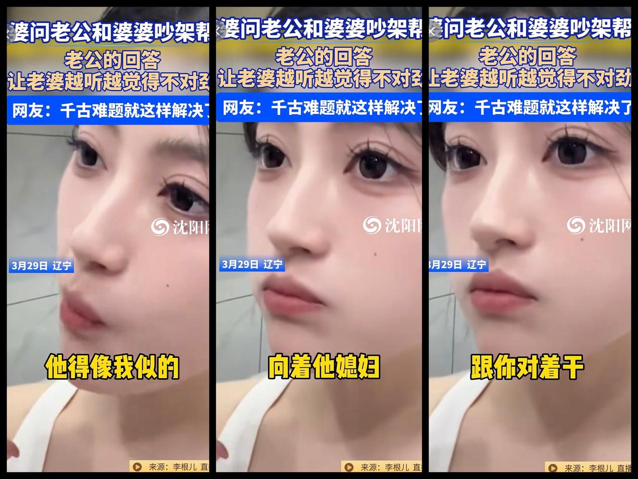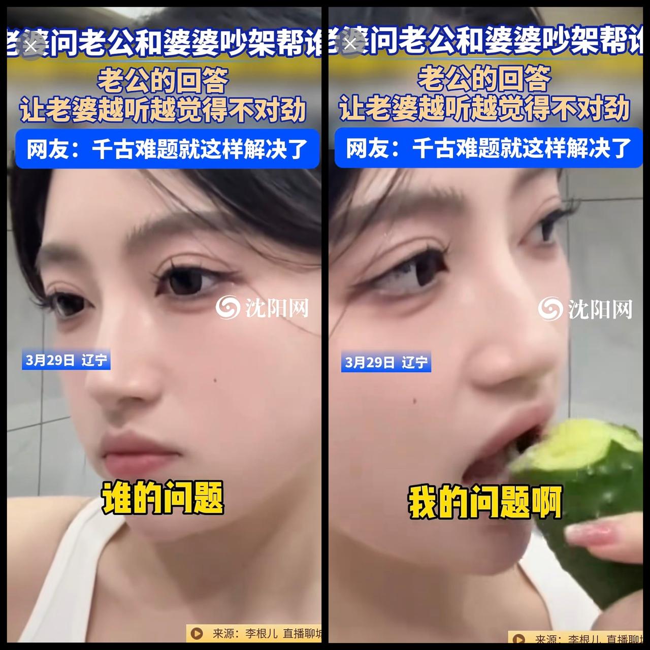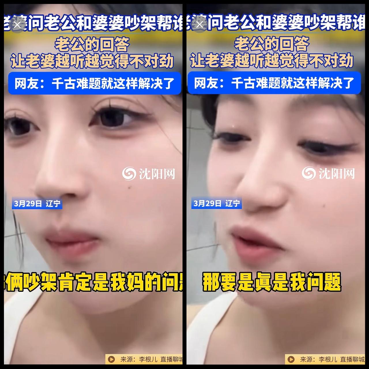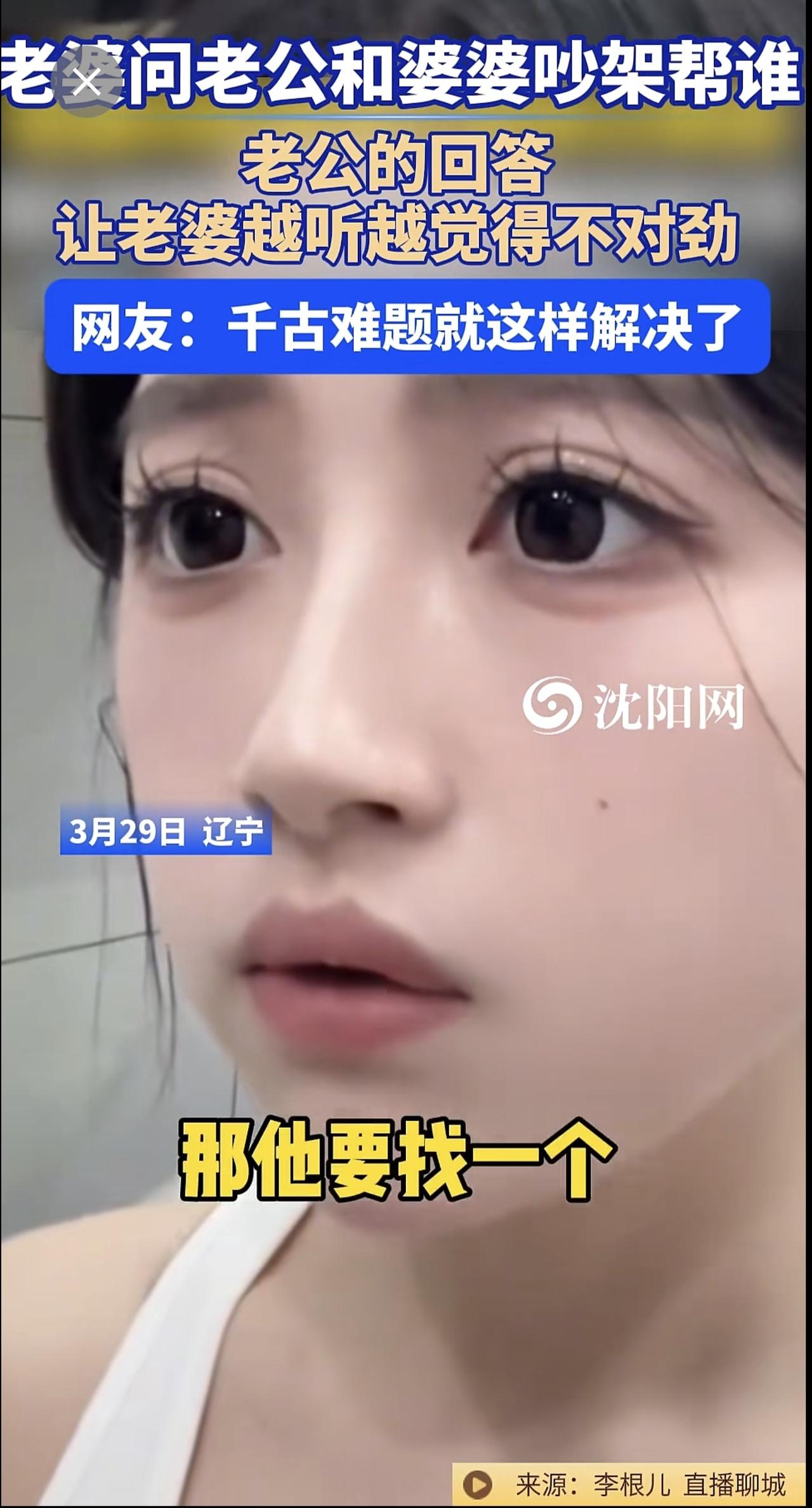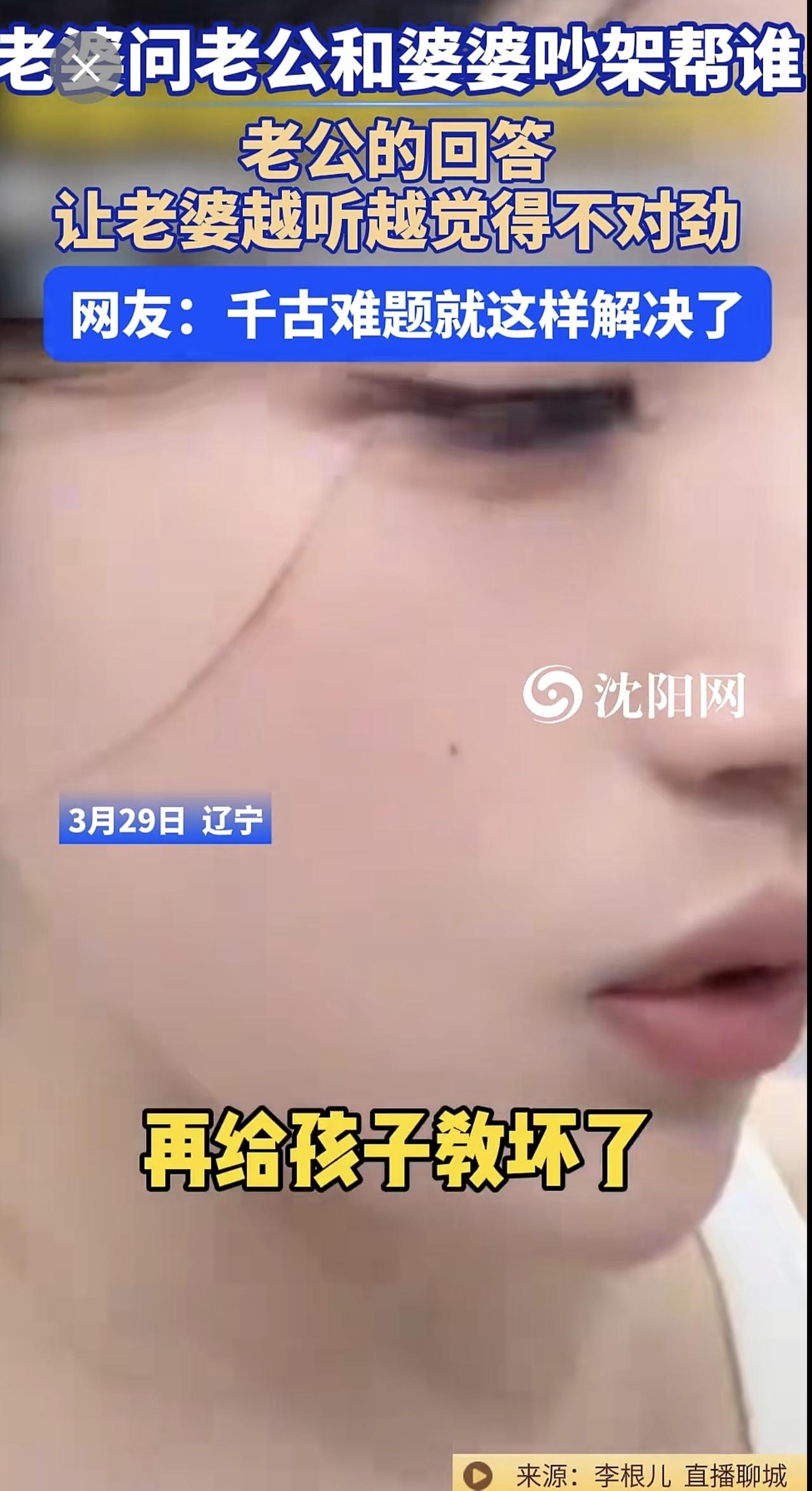 3月29日,辽宁 。老婆问老公和婆婆吵架帮谁?老公的回答让老婆越听越觉得不对劲。网友:千古难题就这样解决了@李根儿33 (编辑:于璐)婆媳