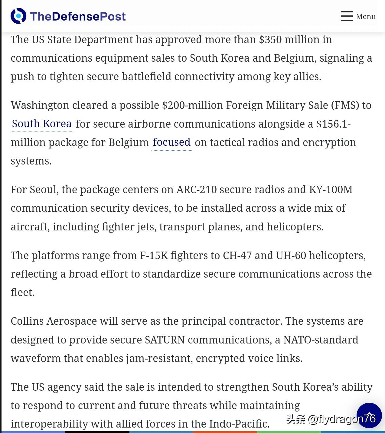 🇺🇸 🇰🇷 🇧🇪 美国批准向合作伙伴国家出售通信设备 美国国务院批准在《对外军售计划》(FMS)框架内向合作伙伴国家出售总价值3.5亿美元的通信设备。 此次出售包括: 🔷韩国 —— 将为各类飞机(包括战斗机、运输机和直升机)配备ARC-210型保密无线电台和KY-100M型通信安全设备。总价值2亿美元; 🔷比利时 —— 将提供AN/PRC型战术无线电台及加密系统。总价值1.561亿美元。