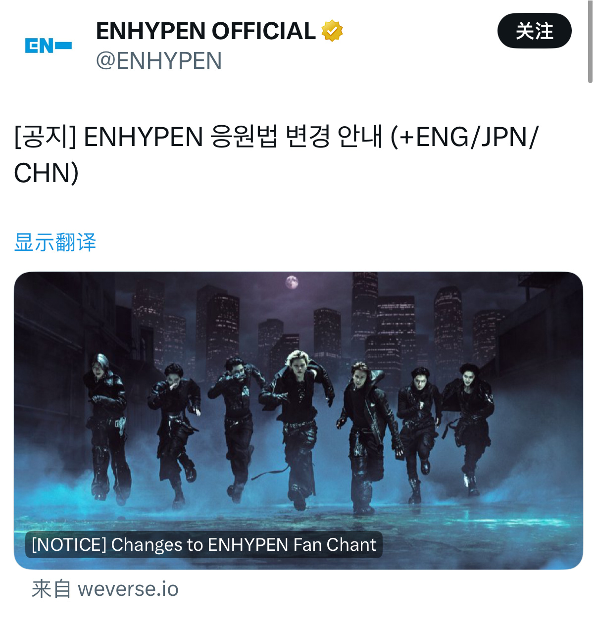 ENHYPEN官方变更了应援法新应援为:梁祯元 朴综星 沈载伦 朴成训 金善禹