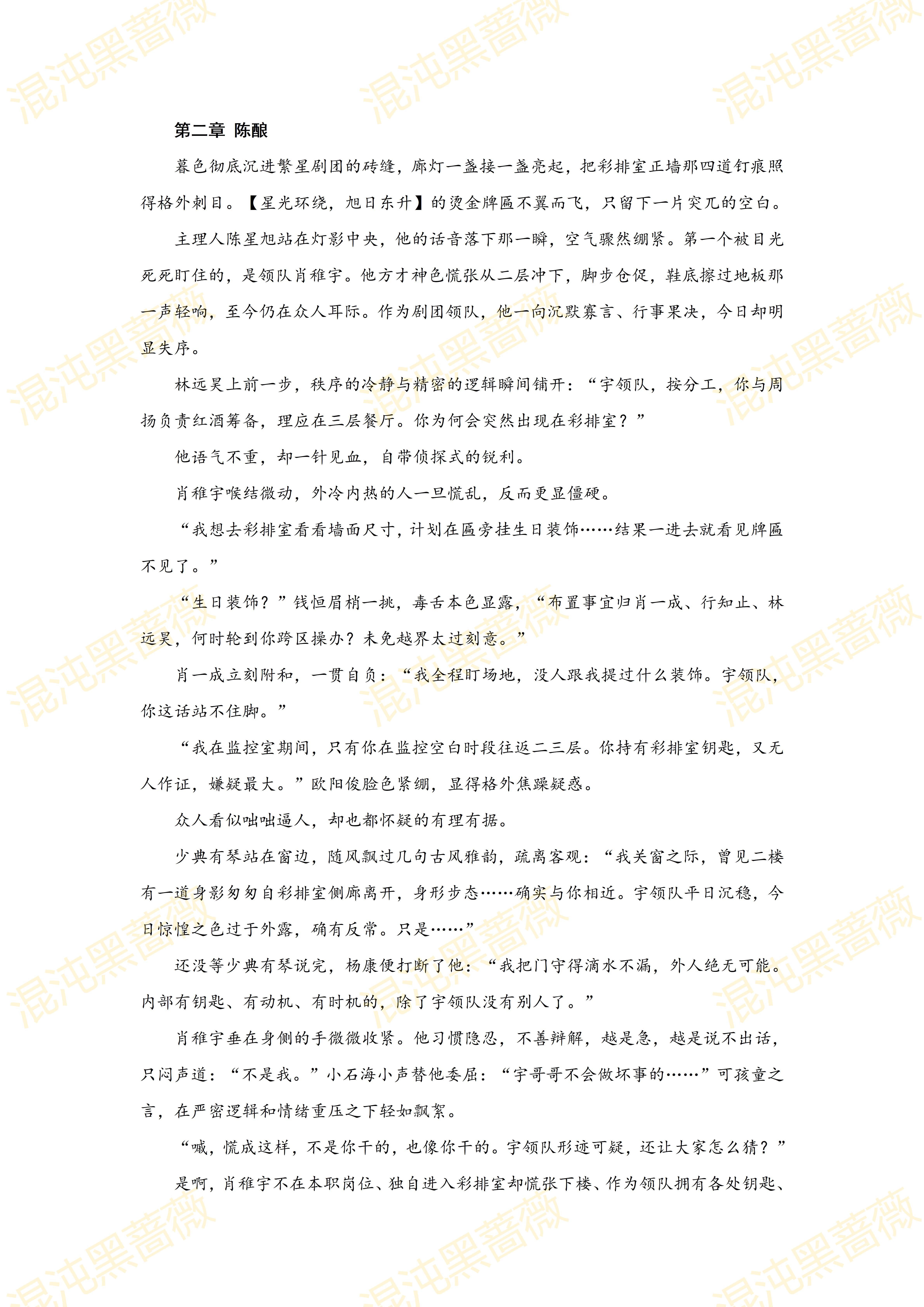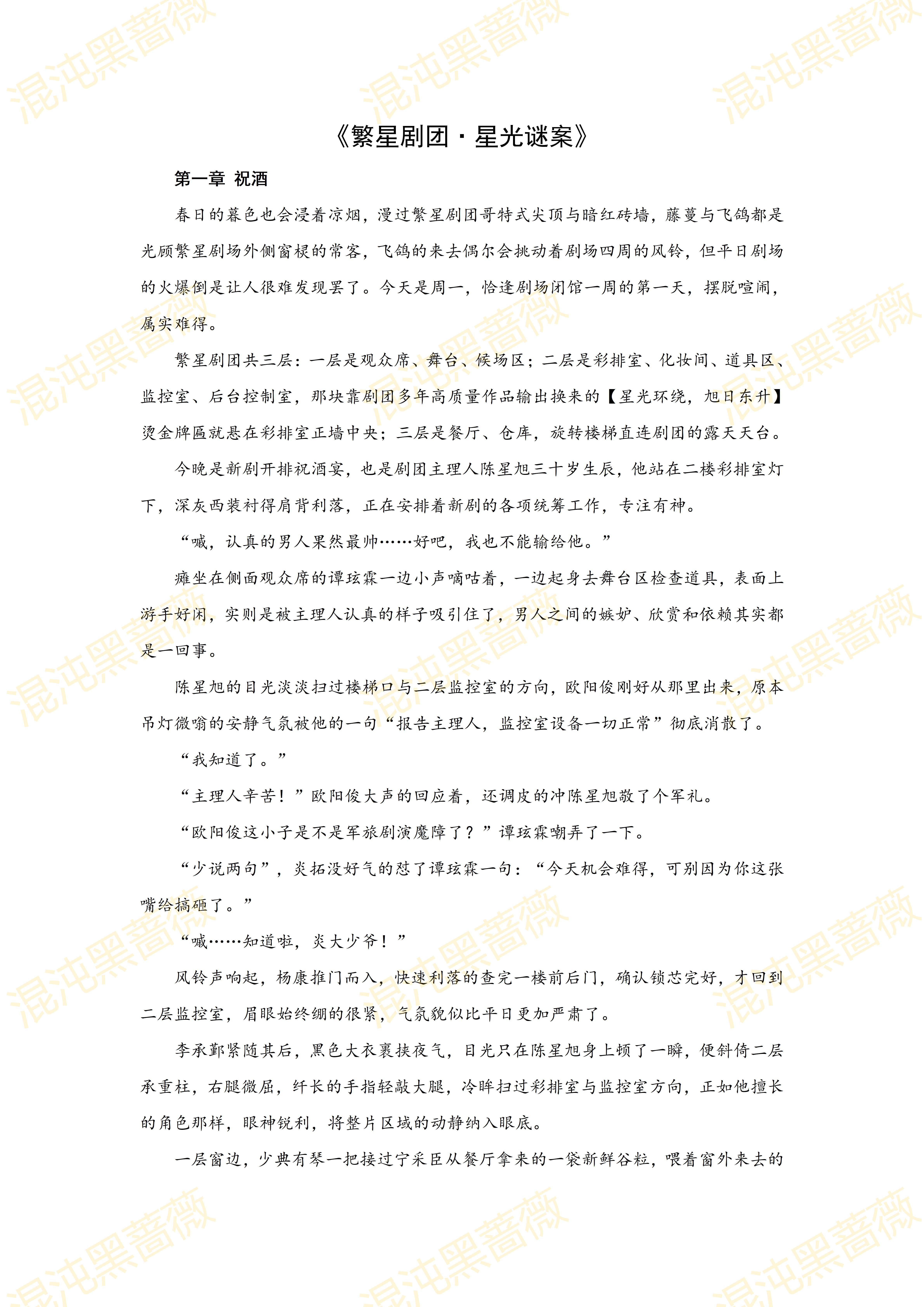 ⭐类别:原创悬疑小说⭐名称:《繁星剧团·星光谜案》⭐作者:⭐制图:⭐预告:网页链接⭐目录:📚第一章:【祝】酒(p2-3) 👉🏻网页链接📚第二章:【陈】酿(p4-5) 👉🏻网页链接📚第三章:【一】冷(p5-6) 👉🏻网页链接📚第四章:【花】约(p7-8) 👉🏻网页链接📚第五章:【而】已(p8-10) 👉🏻网页链接📚第六章:【立】誓(p10-11)👉🏻网页链接📚第七章:【之】交(p12-13)👉🏻网页链接📚第八章:【年】轮(p14-15)👉🏻网页链接📚第九章:【幸】事(p16-17)👉🏻网页链接📚第十章:【福】星(p17-18)👉🏻网页链接📚❤️❤️❤️❤️❤️告白彩蛋: 👉🏻网页链接