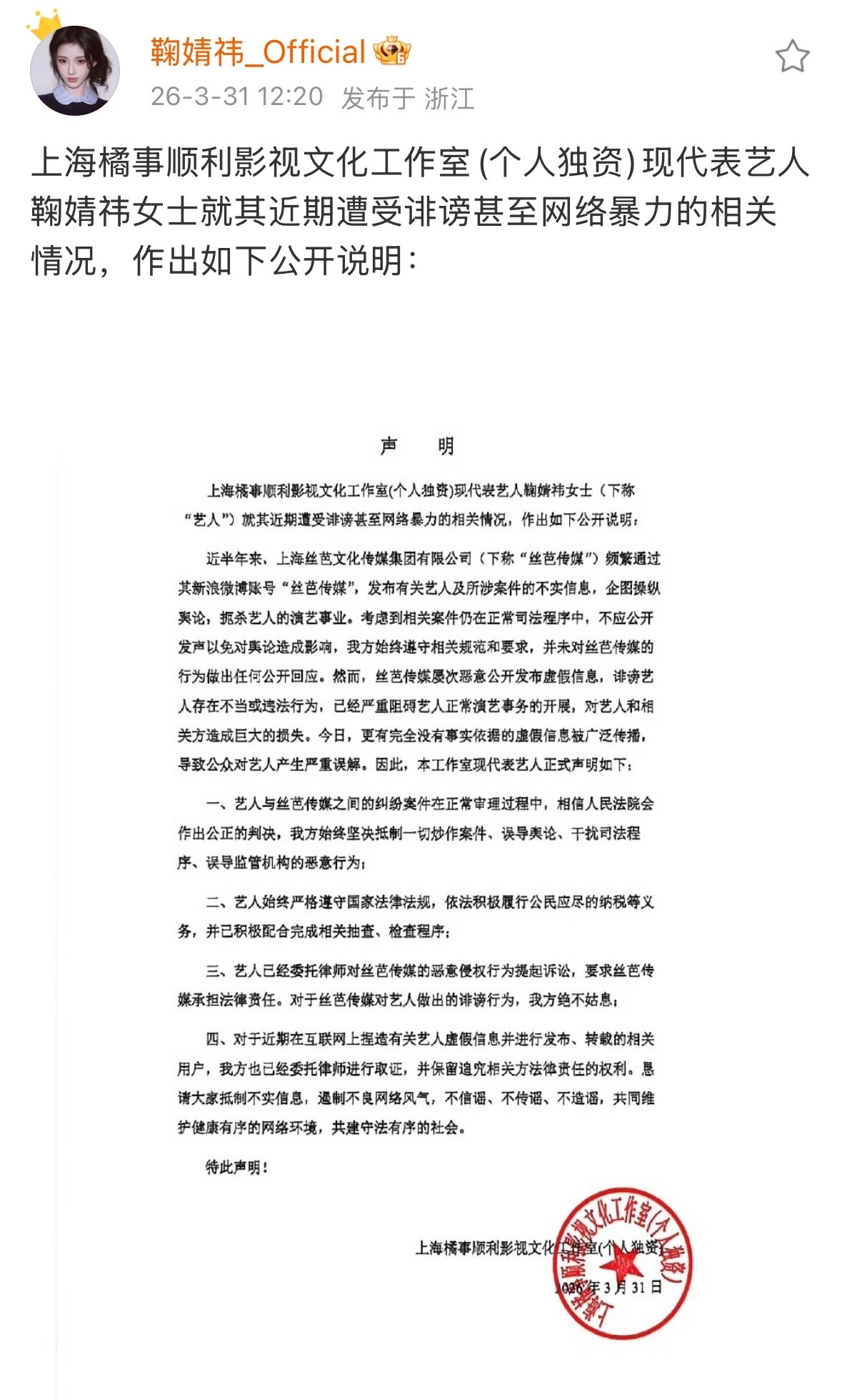 鞠婧祎方称已积极配合完成纳税抽查鞠婧祎方就丝芭的声明 鞠婧祎工作室就丝芭发了声明,表示与丝芭案件正在审理,抵制一切炒作案件、误导舆论,称艺人积极依法纳税,并积极配合完成相关抽查,对于丝芭对鞠婧祎的诽谤行为绝不姑息!!!