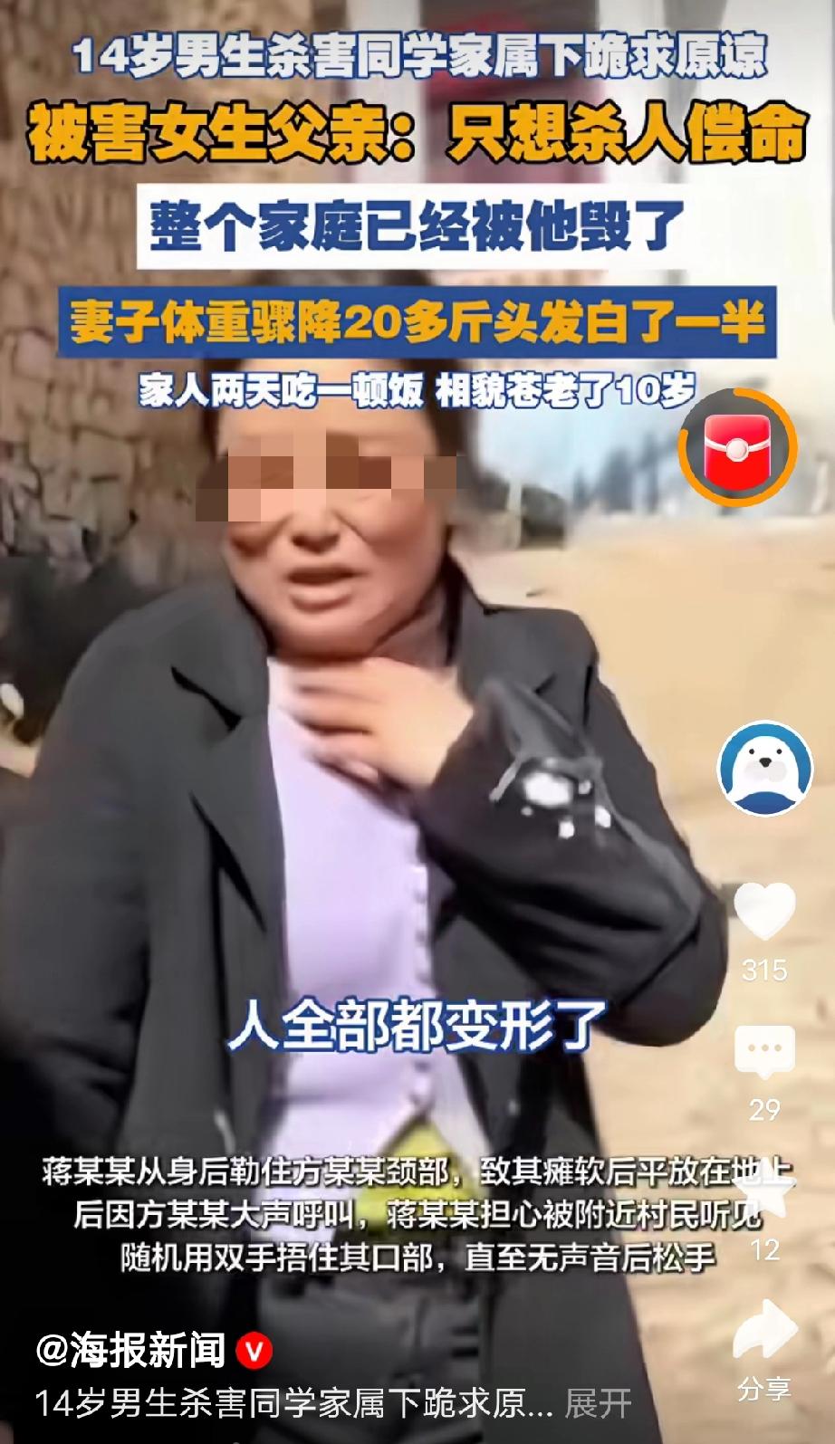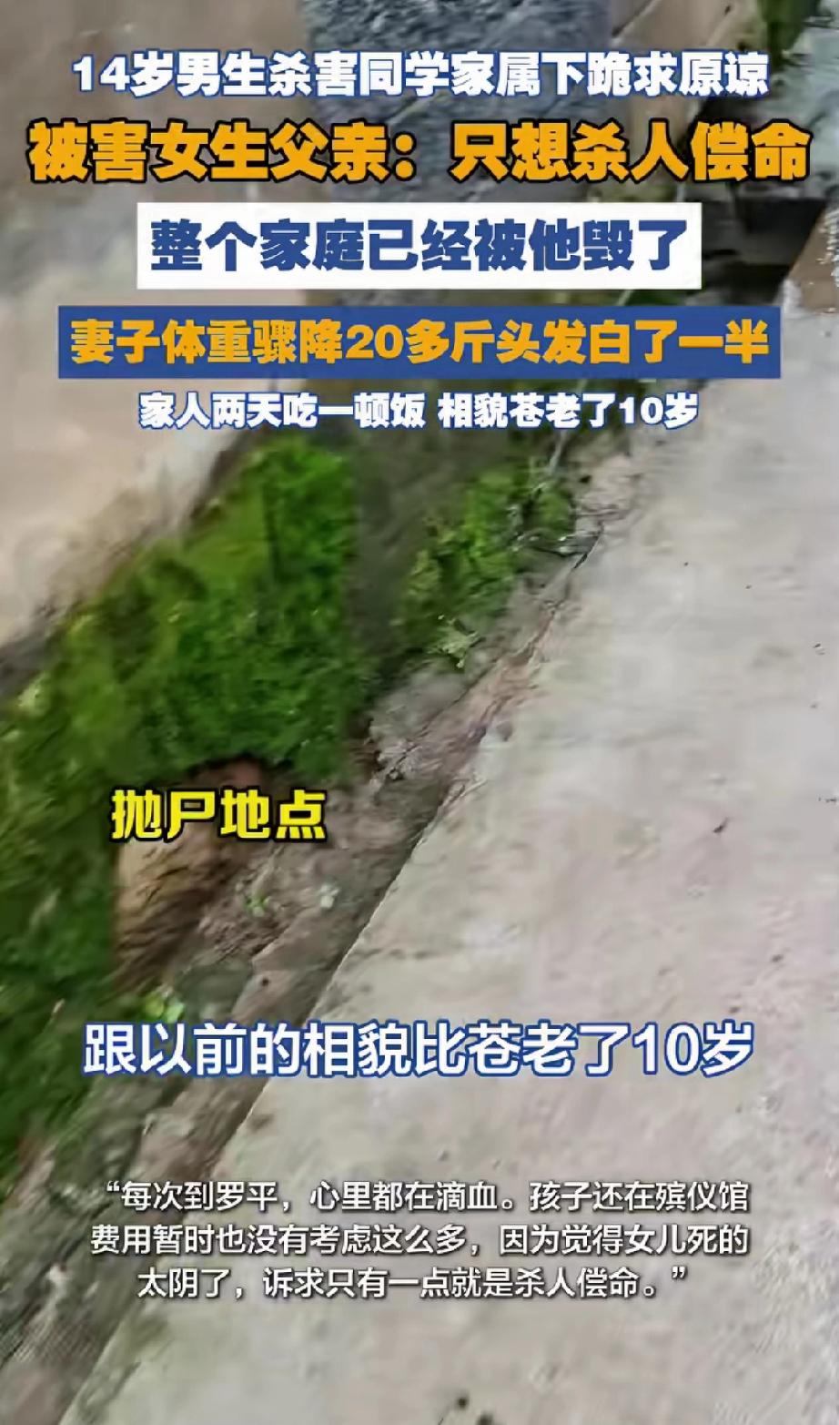 云南曲靖,15岁女生去同学家聚会,结束后14岁男生送她回家,不料,半路男生做出不当举动被拒后,导致女生不幸离世,女生父母悲痛欲绝,短短时间女孩母亲头发白了一半,瘦了20多斤,人看上去老了10多岁,法庭上男生下跪求原谅,并承诺给女生父母养老,女孩父亲坚决表示:一分赔偿都不要,只求依法严惩,为女儿讨回公道。 2025年7月6号,方先生15岁的女儿方某涵接到闺蜜电话,邀请她去家里聚会。 方先生和妻子听到女儿要去玩,便问她是到哪里去聚会,都有谁? 方某涵告诉父母,他们就是同班同学一起聚聚、玩玩,闺蜜家就在某某村不远处。 方先生听到女儿说出了那个地方后,确认她闺蜜离自己家只有600多米,夫妻俩都认为那么近的距离应该问题不大,所以就准许她出去玩玩,毕竟孩子大了有她的社交圈。 而且那段时间正逢暑假,孩子偶尔玩晚一点,大不了第二天给她晚点起床,所以方先生就没过多干涉女儿出行。 没想到,半夜一点多,静悄悄的村子里突然响起了广播,方先生被吵醒后仔细一听,广播里传来:有人在路边发现一个女孩倒在路边,已经没有生命体征。 听到这,方先生夫妇想起了自己的女儿,他们赶紧起身前往女儿的房间,发现女儿还没回来。 他们不禁有些担忧,顾不了那么多,赶忙往事发地跑。 当方先生来到事发地,只看到他们的女儿,躺在地上一动不动,方先生夫妇赶紧冲过去抱住女儿,发现她已经没了呼吸。 夫妻俩悲痛欲绝,当场报警,民警通过排查同行人员,当晚聚会、送人的只有蒋某某与方某涵同行,是最后接触者,之后民警又查看了周边的监控视频,最终锁定嫌疑人蒋某某。 另外还有村民告诉方先生,当天晚上大概12点左右,蒋某某还到附近老人家讨水喝,目的应该是查看是否有人发现异常。 警方结合各种证言证词,在7月7号当天将蒋某某抓获。 当天,面对民警的到来,蒋某某洋装镇定,正准备出门跟母亲上山采蘑菇,民警把他带走时,他还一副很无辜的表情。 可当民警审讯时拿出监控后,蒋某某绷不住了,很快承认了相关事实。 随着案件一步步查清,女孩不幸离世的完整经过也浮出水面,留给两个家庭的却是无尽的伤痛与悔恨。 事发三天后,蒋某某家人登门道歉,并下跪请求方先生原谅。 可失去女儿的锥心之痛,又岂是几句道歉就能抹平的?无论对方如何恳求,方先生夫妇始终无法原谅。 法庭上蒋某某下跪请求方先生夫妇原谅,并承诺以后会给他们养老送终,但方先生夫妇没有原谅。 方先生坚决表示,一分赔偿不要,只要求依法严惩凶手。 不过,据了解蒋某某作案时距离满14周岁还有一个多月。 相关法律规定,已满十二周岁不满十四周岁的人,情节恶劣的,经核准追诉的,应当负刑事责任。 已满十四周岁不满十六周岁的人犯严重罪行应当负刑事责任,对不满十八周岁的人犯罪应当从轻或减轻处罚。 蒋某某作案时还差一个月才满十四周岁,属于十二至十四周岁区间,情节极其恶劣,必须经核准追诉才能追责,并非绝对不担责。 相关法律规定,情节严重者将处以重刑,结合未成年人不适用死刑的规定,即便核准追诉蒋某某也不会被判死刑。 蒋某某行为恶劣,已涉嫌严重违法,法庭上道歉、承诺养老都不能抵消罪行,只能作为悔罪参考,受害者家属放弃赔偿只求严惩的态度,相关部门在处理时会充分考量,法律不会因年纪小就放任恶性行为,一定会依法给出公正结果。 写在最后:真的希望所有人都能引以为戒,不管年纪大小,都要守住法律和道德的底线,别一时冲动犯下大错,既毁了别人一生,也搭进去自己的一辈子,更要懂得尊重他人,敬畏法律,千万不要走上违法犯罪的绝路。