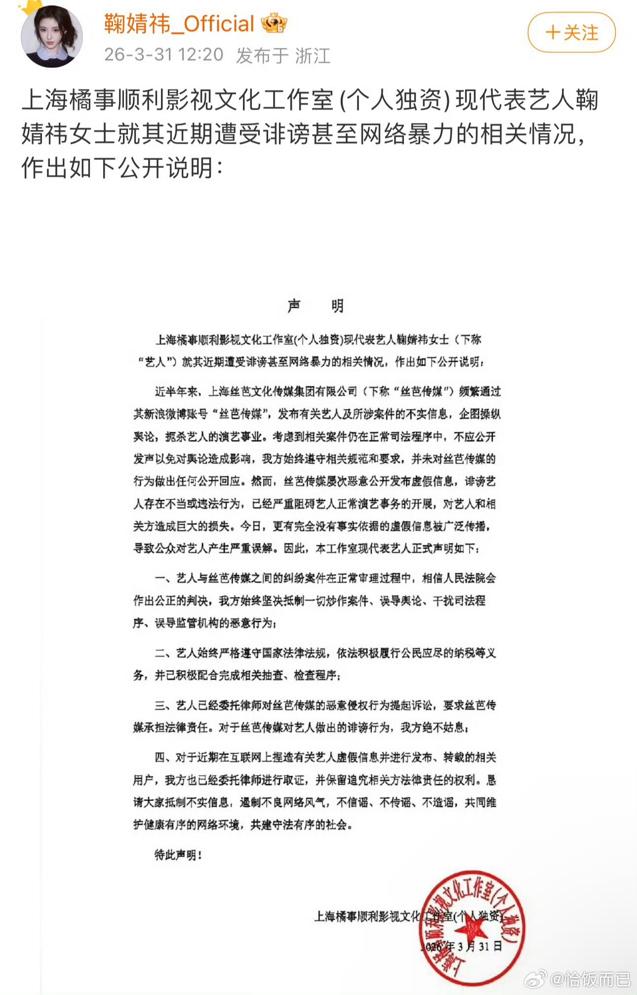 鞠婧祎工作室回应了丝芭划重点:说丝芭干扰舆论影响司法自己积极配合调查