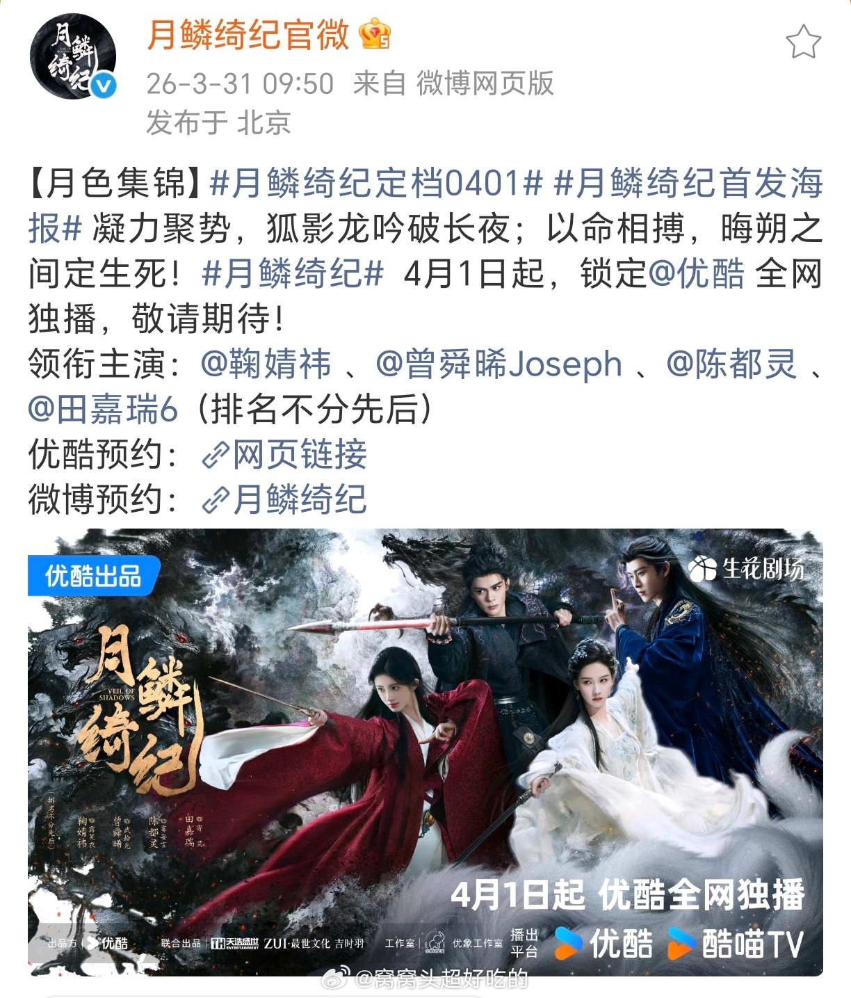 鞠婧祎 曾舜晞 陈都灵 田家瑞《月鳞绮纪》定档了,看看状态