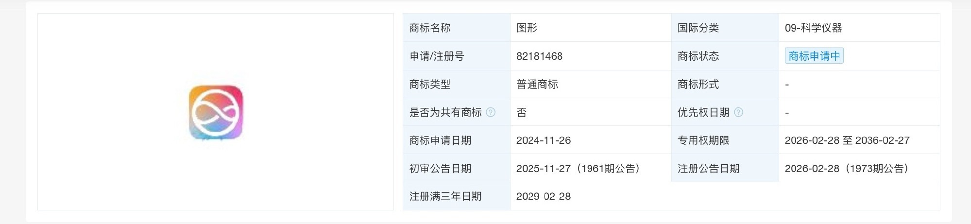 天眼查知识产权信息显示,2024年,苹果公司已在中国申请注册多枚苹果智能相关图形商标,国际分类涉及网站服务、教育娱乐、科学仪器等,当前多枚商标已被驳回复审,部分商标状态为初审公告。