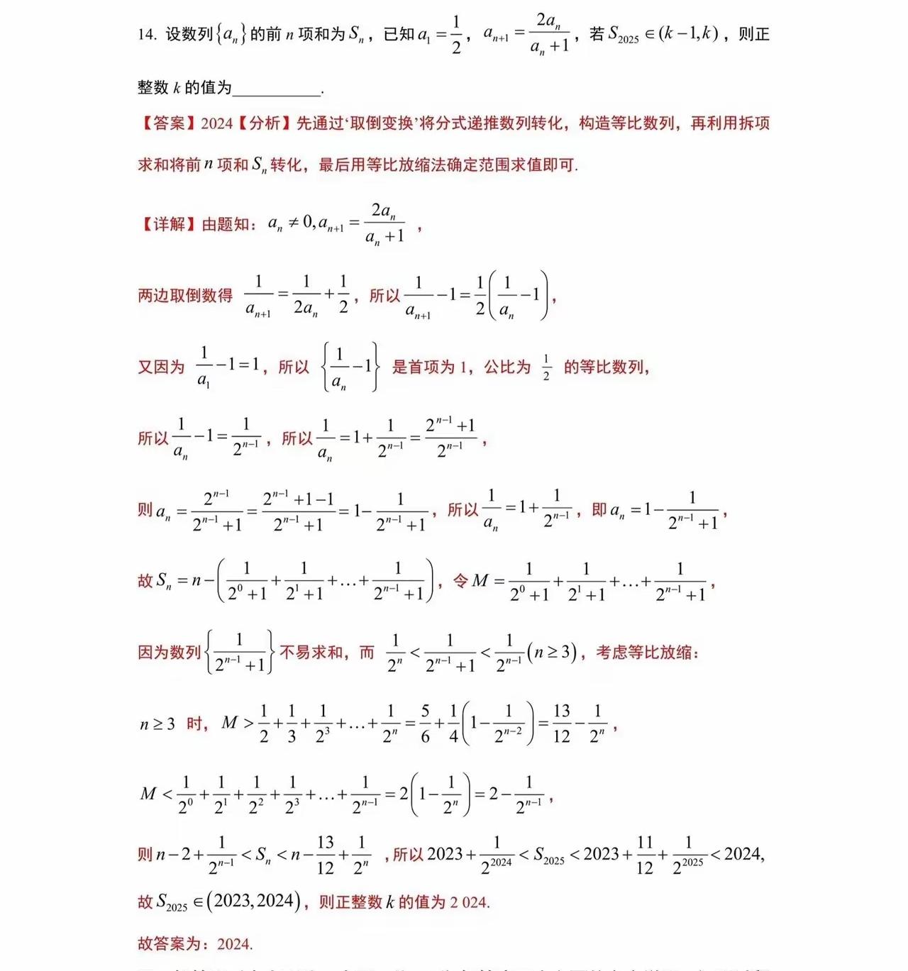 江苏省某地市一模数学考试压轴填空题第14题有关数列的题目,先通过“取倒变换"将分式递推数列转化,构造等比数列,求通项公式,再利用拆项求和,由于不能直接求和,将通项公式放缩,求数列前n项和sn的取值范围即可。