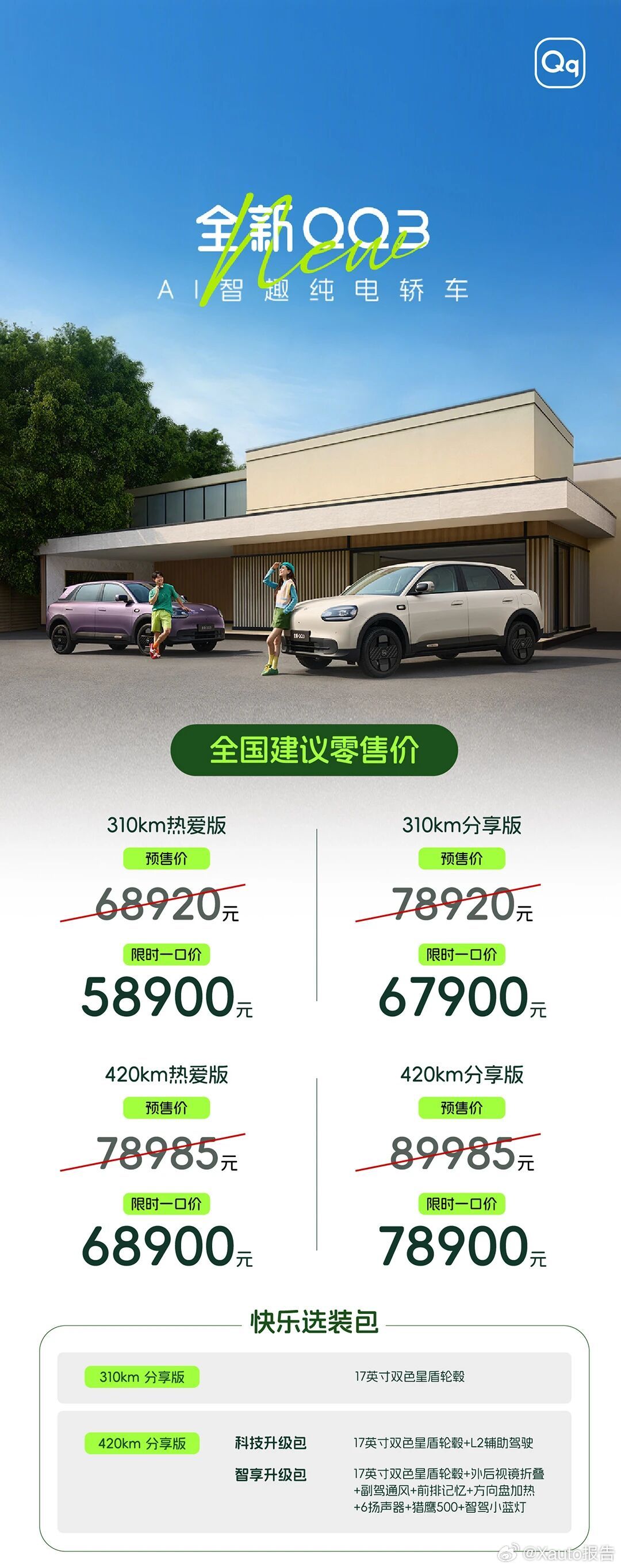 全新QQ3正式上市,上市即斩获56879台订单,市场热度高涨,以热销实力宣告王者归来,成为备受关注的热门车型。奇瑞全新QQ3限时一口价5.89万起全新QQ3上市王者归来一部到位奇瑞qq