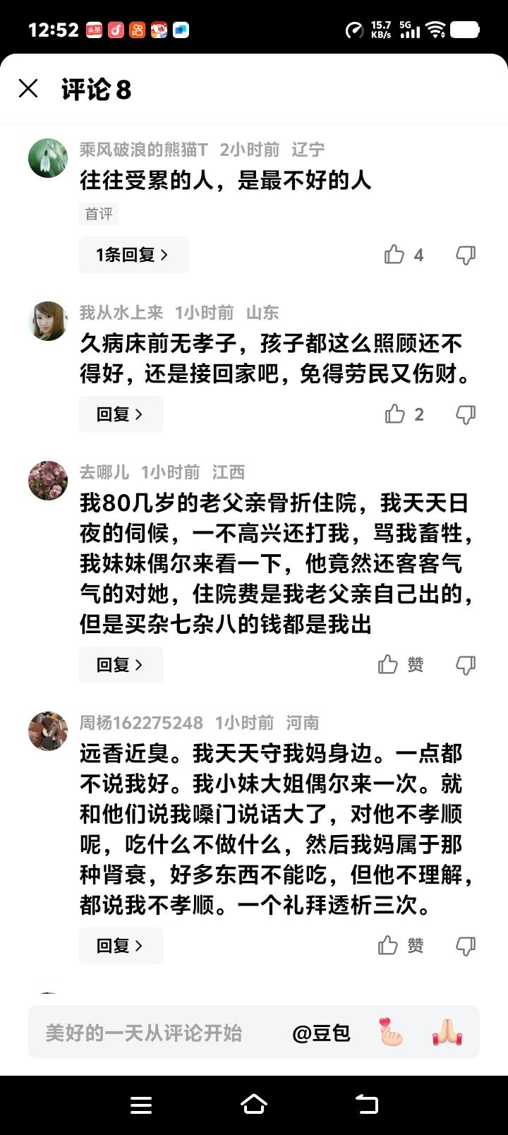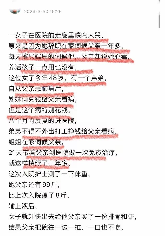 郑州肺癌父亲病房怒摔排骨大虾,当众辱骂48岁贴身孝女“心毒”,病友忍无可忍痛斥揭开千万家庭隐痛! 医院走廊的哭声撕心裂肺,那是一位中年女儿积压一年多的委屈决堤。她辞去工作,日夜守护肺癌父亲,换来的却是当众推开的饭盒和一句“心毒”。病痛不仅吞噬健康,更在啃噬人性最柔软的亲情纽带。 临床病友的怒吼,像一记耳光打醒了沉默的病房。他亲眼见证这位女儿一夜起身十几次,端屎端尿毫无怨言。当付出被践踏成泥土,连陌生人都忍不住为之愤慨。这何尝不是许多家庭不敢言说的痛? 父亲瘦到只剩九十九斤,女儿心疼买来排骨大虾,却被一把推开。病魔扭曲的或许不是爱,而是表达爱的能力。当死亡阴影笼罩,恐惧常化为利刺,扎向最亲近的人。这不是个例,而是无数病患家庭的缩影。 弟弟远走他乡拼命挣钱,姐姐贴身伺候耗尽心血。中国式亲情总在默默牺牲,却往往败给一句伤人的话语。那份被推开的虾,凉的是饭菜,寒的是人心。可悲的是,这样的故事几乎每天都在医院角落上演。 网友的愤怒涌成浪潮。有人痛斥偏心父母捂不热,有人建议转身离开。但真正身处其中的人才知道,转身二字写来容易,做来却如剜心。血缘的枷锁,社会的目光,良心的拷问,织成一张逃不开的网。 理智的声音在提醒,莫与重病之人较真。当疼痛日夜不休,当尊严被病床禁锢,发泄成了唯一的出口。而子女往往成为最近的靶子。这不是原谅的理由,却是理解的起点。 姑娘靠在冰冷墙面的身影,是无数中年子女的写照。上有老下有小,自己却不敢病不敢倒。当父母老去成为孩子,角色互换带来的不仅是体力透支,更是情感世界的天崩地裂。 这场病房风波照见的,是比癌症更残酷的亲情考验。它逼我们直视:当付出被视为理所当然,当孝顺变成单方面消耗,中国式养老究竟该何处安放?每一个在病床前坚守的人,都需要一盏温暖的灯。 (来源:根据河南郑州医院真实事件及网络热议综合整理) 孝顺困境 人性真相