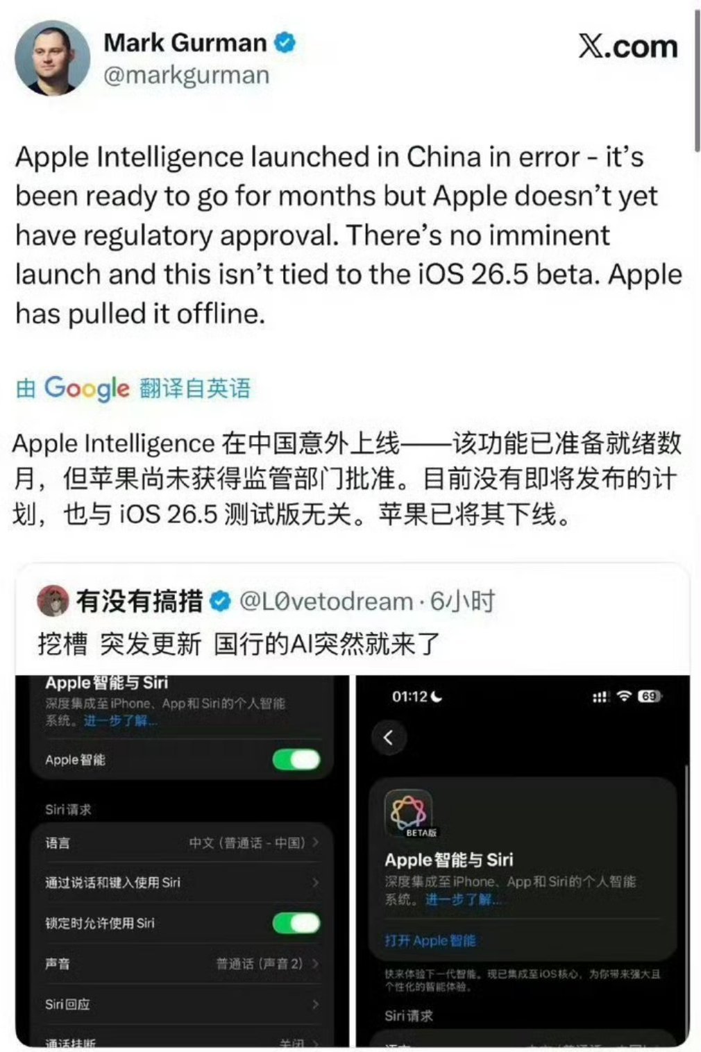 苹果回应推送国行版AI这个好像是和百度合作的好消息是突然上线了坏消息是操作失误又