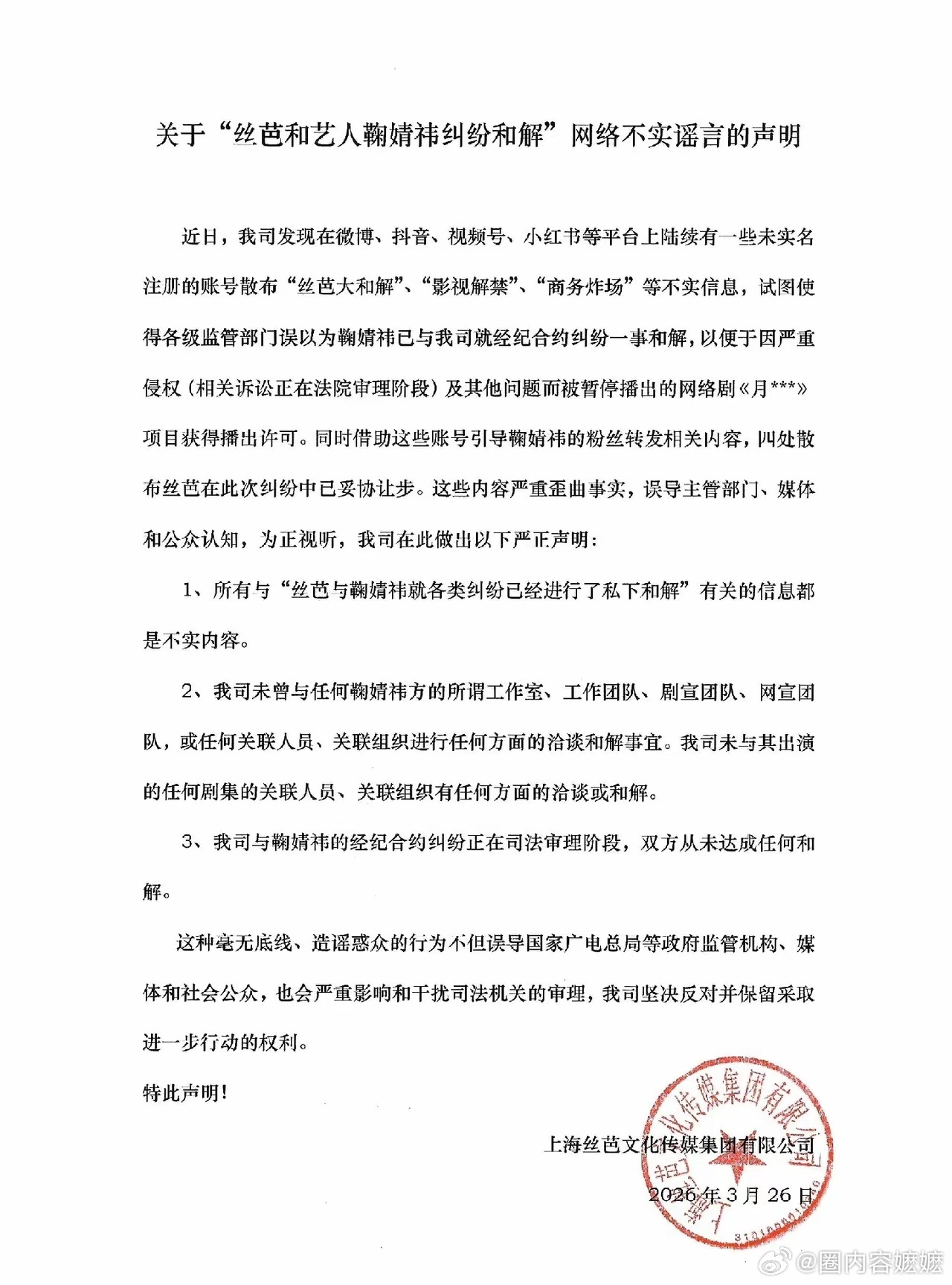 鞠婧祎工作室声明 鞠婧祎这事一出,给所有明星都提了个醒,你可以没有演技,没有代表作,但千万不能有把柄。丝芭说鞠婧祎瞒报收入这事,目前还不知道真假。但却切切实实地提醒了所有明星,你们收入那么高。一定要如实上报,才能保证自身的清白干净。像某伦,明明靠着《香蜜》大爆,又有颜值又有演技,结果如今已经查无此人了。你流量再高,粉丝粉丝再多,都不是你的挡箭牌,只有清白合规才能走的更长远。遇到纠纷也不会被拿捏。娱乐评论大赏