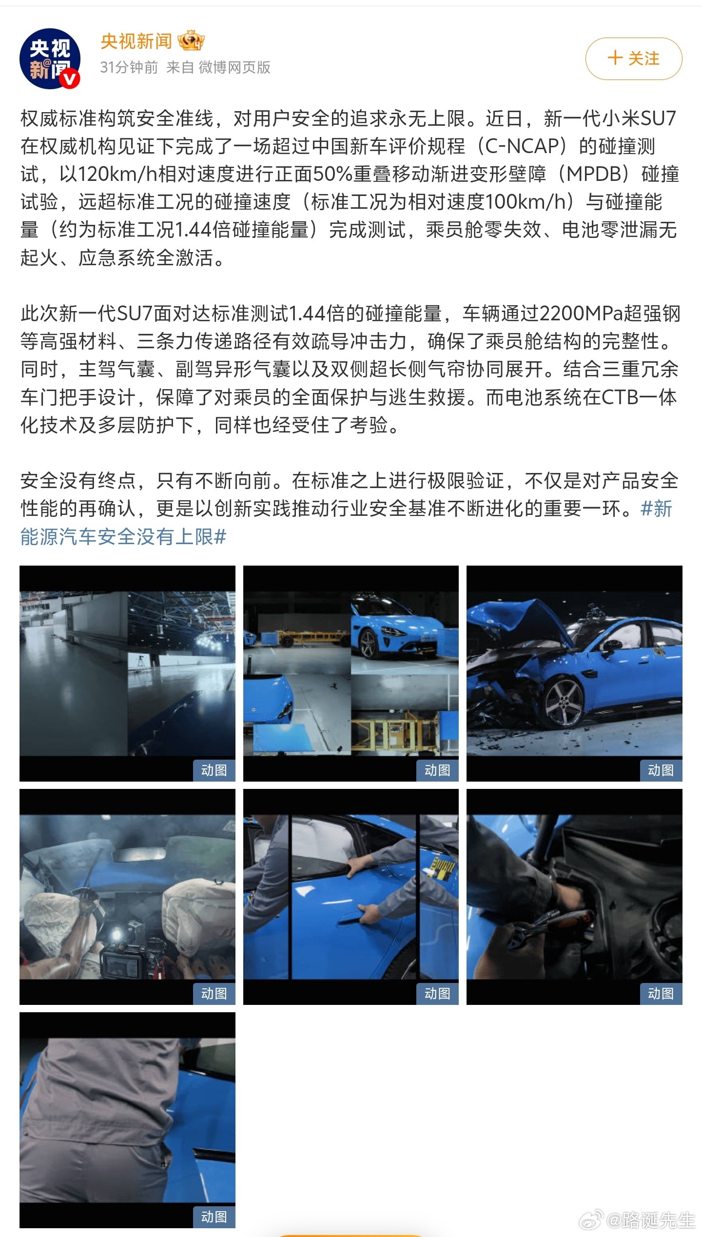 新能源汽车安全没有上限央媒发文高度肯定小米新SU7的安全性,特别是120km/h相对速度进行正面50%重叠移动渐进变形壁障(MPDB)碰撞试验,虽然前几天被一些人抓住雷军口误,扣字眼找茬好几天,但这种试验毫无疑问还是证明了小米新SU7的安全性、可靠性。