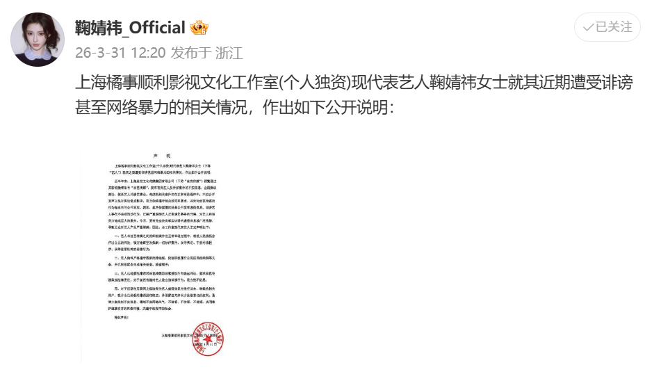 鞠婧祎工作室声明完全相信我姐,明天要看月鳞绮纪了 其他不看不要理就好!明天中午十