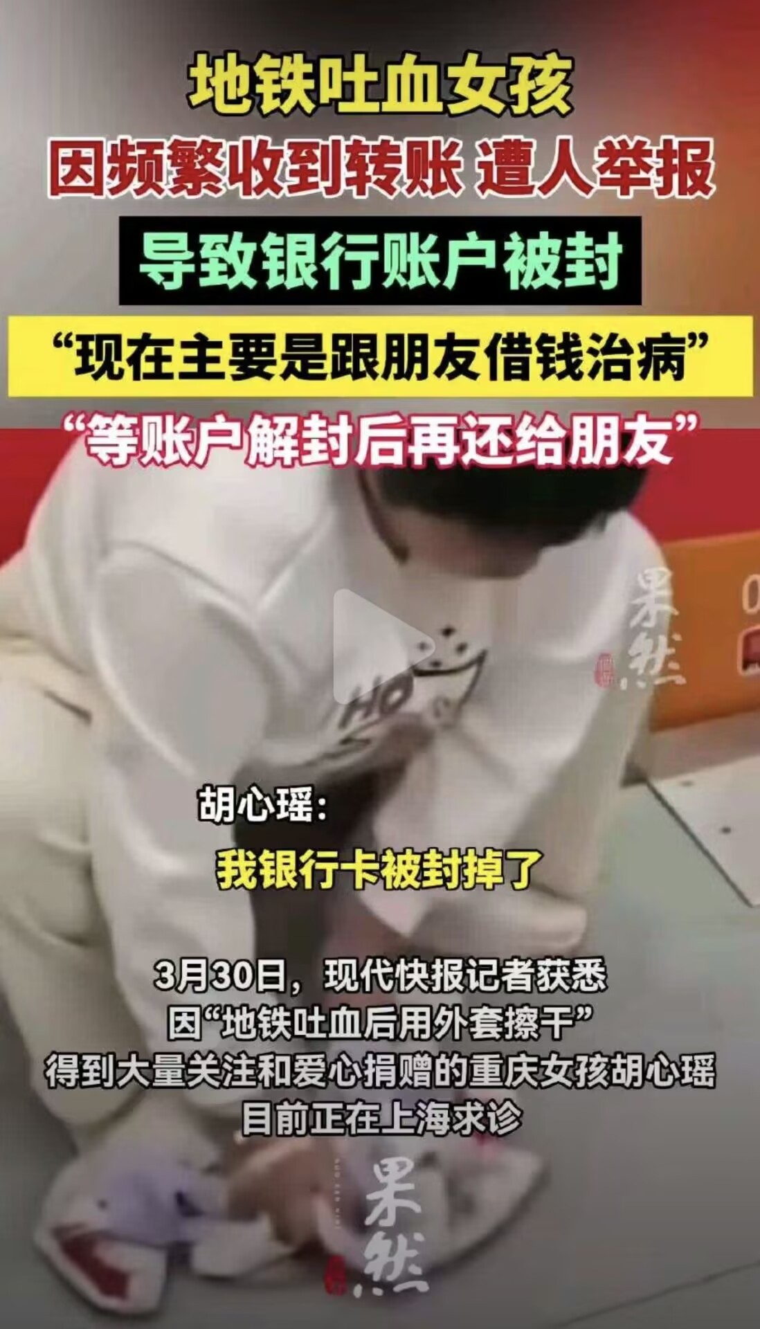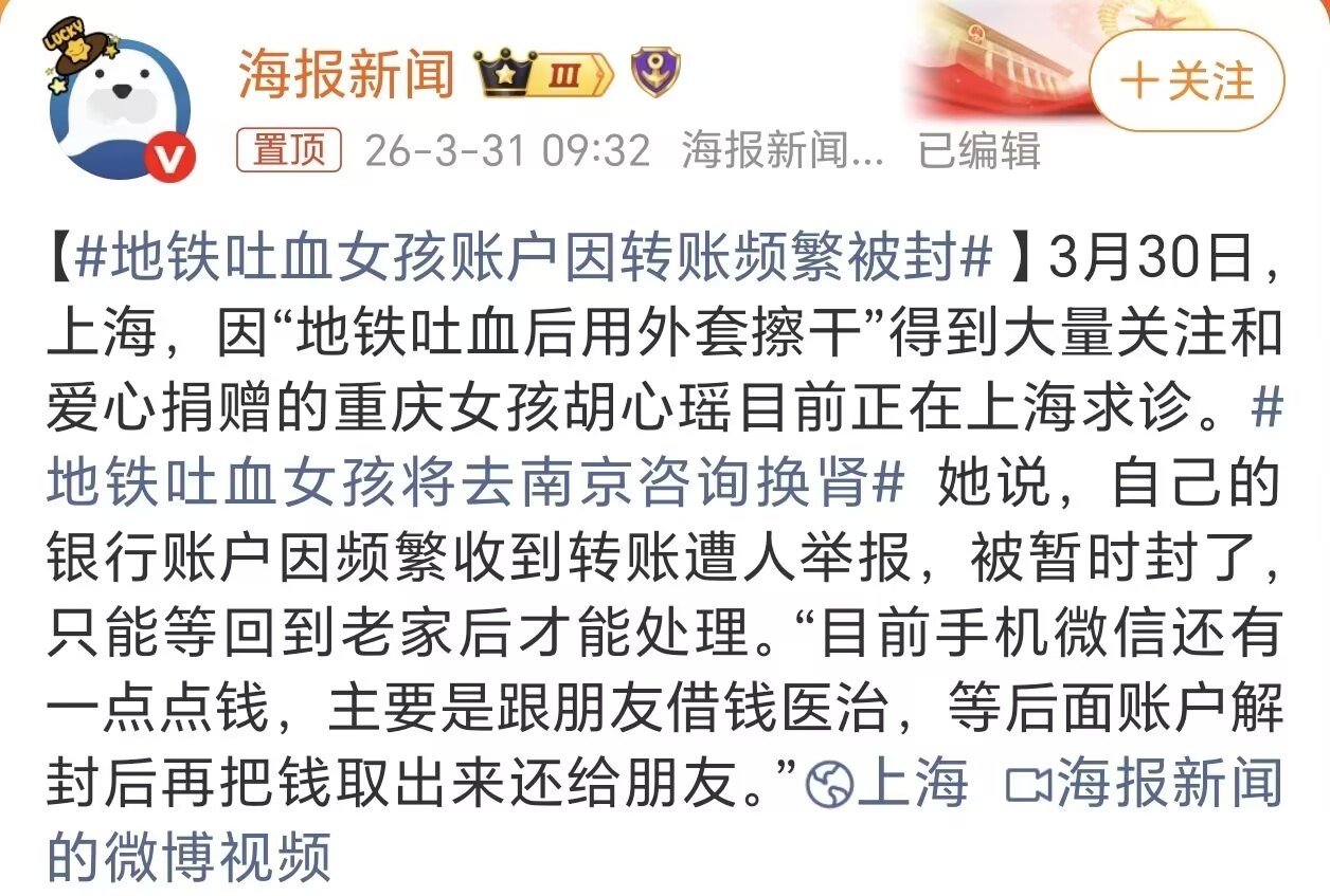 人家凑来的治病救命钱,居然直接被风控封了?骗子大额转账没人管,偏偏盯着这点救命钱卡着不放。风控本来是守护,不是给难上加难的人添堵的地铁吐血女孩账户因转账频繁被封