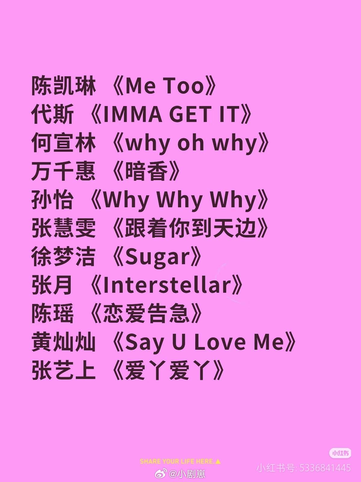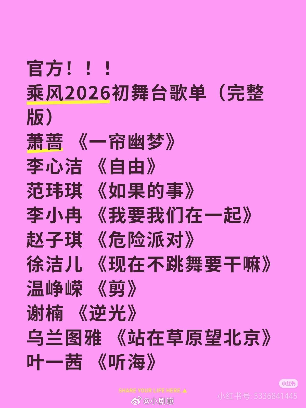 乘风2026初舞台歌单正式官宣!具体歌曲名单如下!萧蔷 《一帘幽梦》李心洁 《自由》范玮琪 《如果的事》李小冉 《我要我们在一起》赵子琪 《危险派对》徐洁儿 《现在不跳舞要干嘛》温峥嵘 《剪》谢楠 《逆光》乌兰图雅 《站在草原望北京》叶一茜 《听海》王濛 《我的眼睛就是尺》者来女 《高岭之花》+《刀剑如梦》曾沛慈 《一个人想着一个人》陶昕然 《采莲》淡淡 《Can't Escape》江语晨 《最后一页》唐艺昕 《I'm Not Yours》阚清子 《爱的代价》侯宇 《赤伶》+《新定军山》庄法 《MOONLIGHT》维妮娜 《TAJIN》陈凯琳 《Me Too》代斯 《IMMA GET IT》何宣林 《why oh why》万千惠 《暗香》孙怡 《Why Why Why》张慧雯 《跟着你到天边》徐梦洁 《Sugar》张月 《Interstellar》陈瑶 《恋爱告急》黄灿灿 《Say U Love Me》张艺上 《爱丫爱丫》安崎 《花儿为什么这样红》你最期待谁?