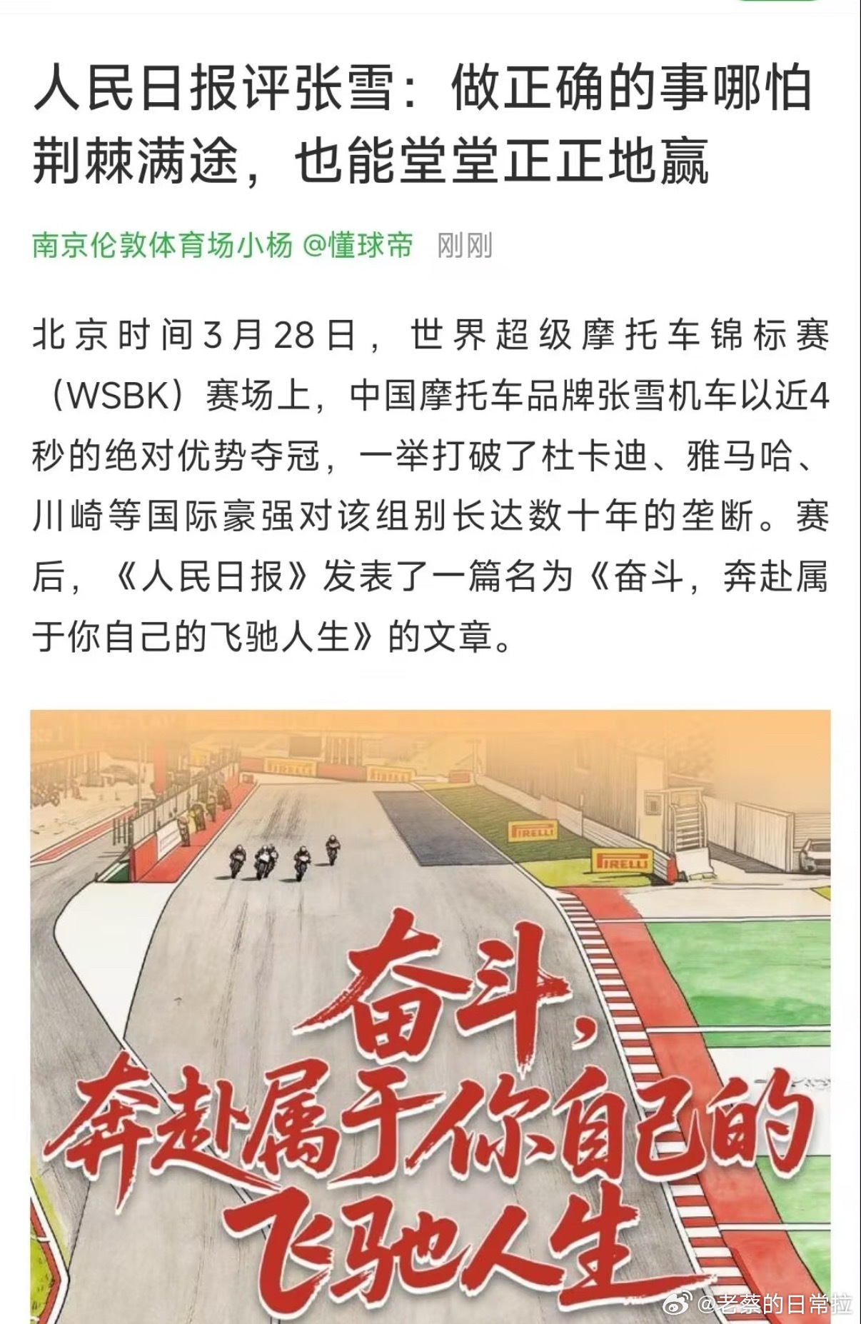 人民日报评张雪 人民日报盛赞张雪:以20年死磕核心技术,书写“爬坡过坎”的飞驰人生!从山村修车学徒到打破欧美日37年垄断,他用自主研发让五星红旗在WSBK赛场升起,是中国制造逆袭的鲜活样本,更是新质生产力的生动实践!人民日报评张雪奋斗是逆天改命密码