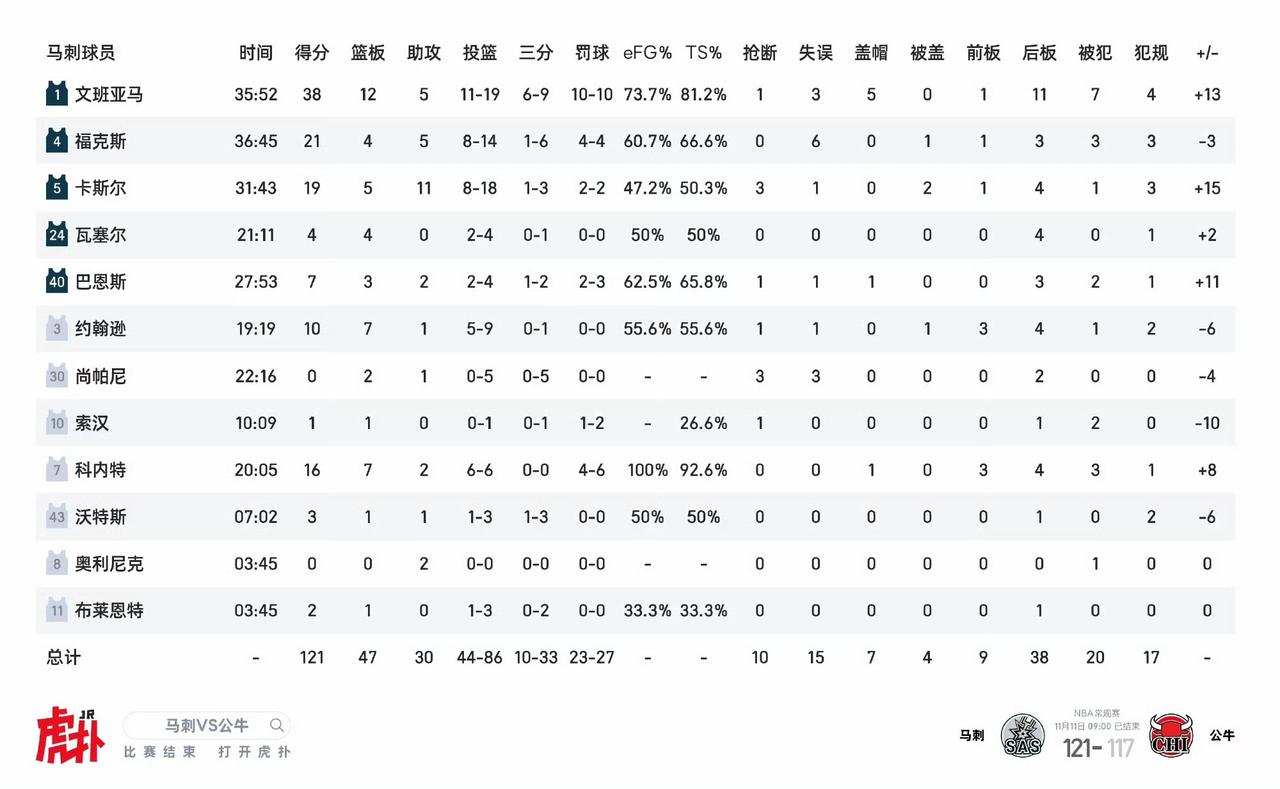 亚历山大狂罚25球,活塞全队仅23次罚球,东西部榜首大战,雷霆加时险胜赢下对决。 怪不得网友说任何球队打雷霆都是5打8。虽然雷霆有惊无险拿下了活塞,但不得不承认,活塞偷偷成为了NBA哨子最好的球队之一。 缺少了球队前五得分手的活塞,依然在客场把联盟第一雷霆拖进了加时赛。 雷霆114-110活塞,亚历山大19中12砍下47分,其中罚球25个。 马刺129-114公牛,文班亚马27中17轰下41分,其中罚球4个。 选MVP,谁都知道该选谁了吧!