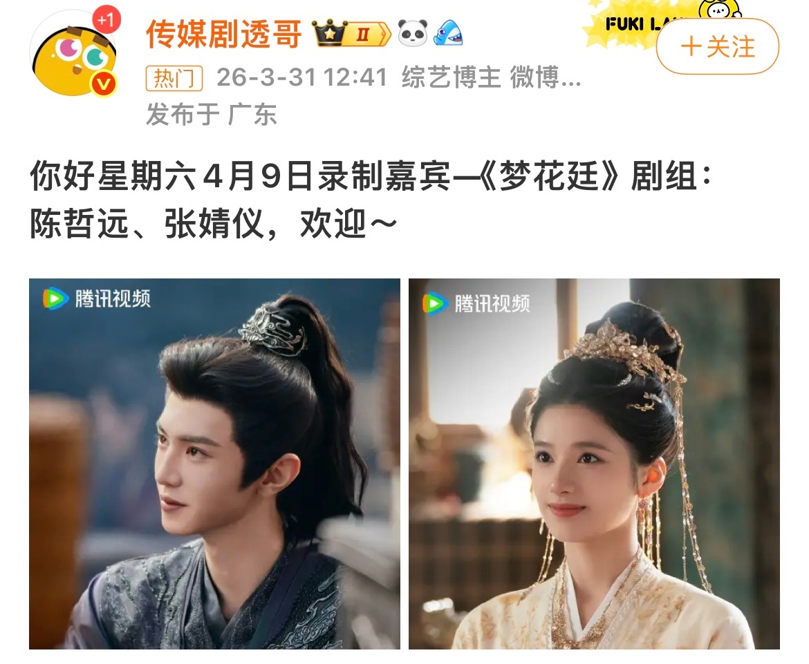 陈哲远张婧怡4月9号要录hi6了,是不是《梦花廷》也快定档了好期待啊!