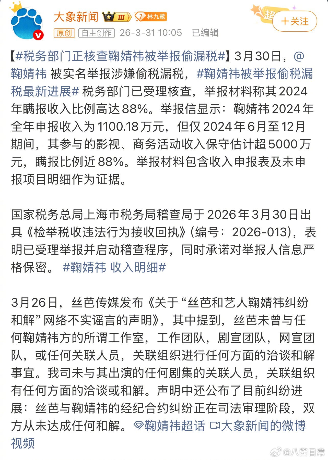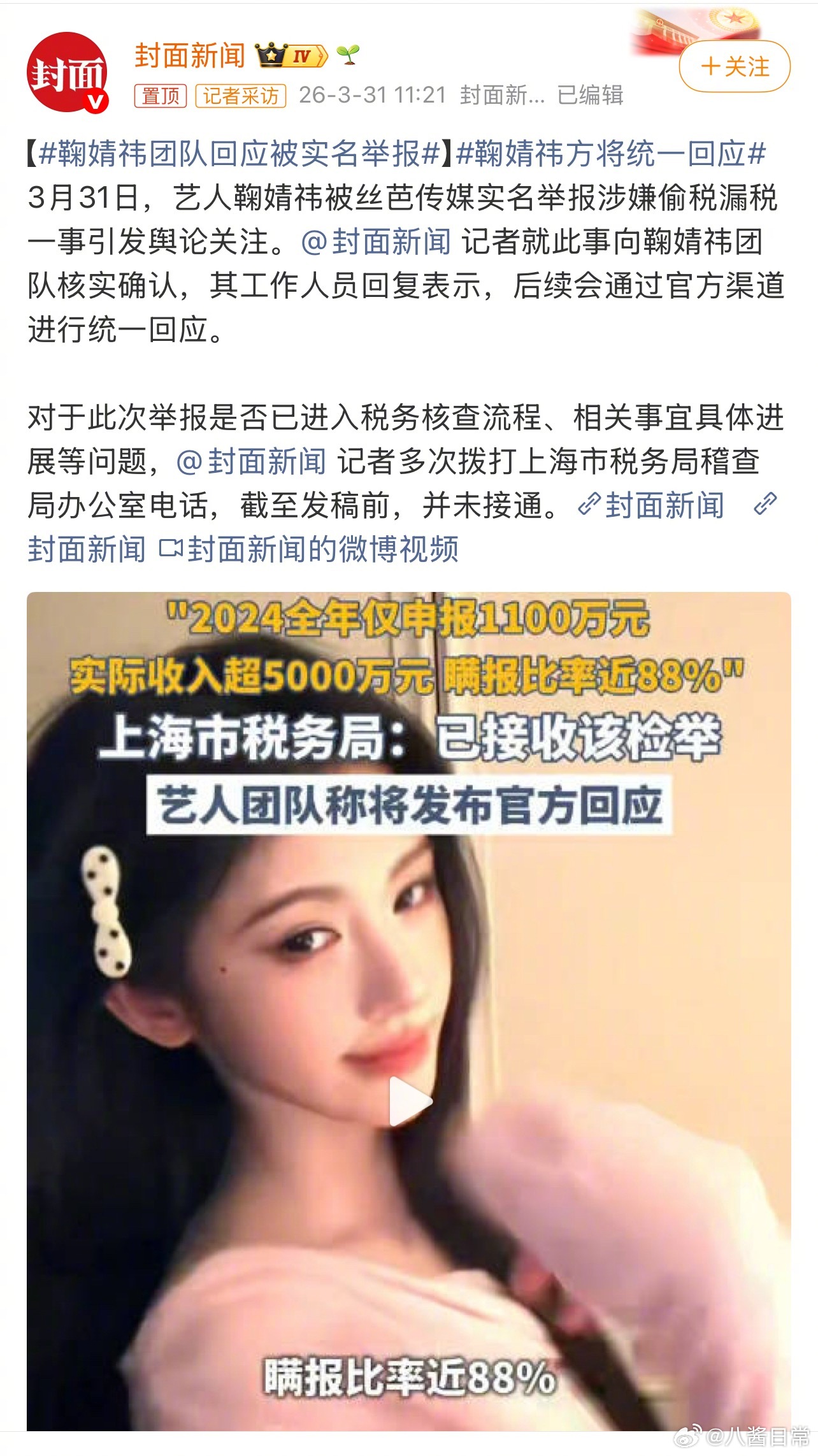 封面新闻记者就实名举报涉嫌偷税一事向鞠婧祎团队核实,鞠婧祎工作人员回复后续会通过官方渠道进行统一回应