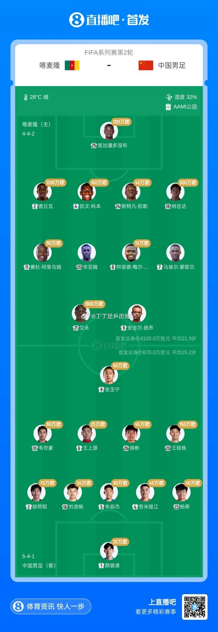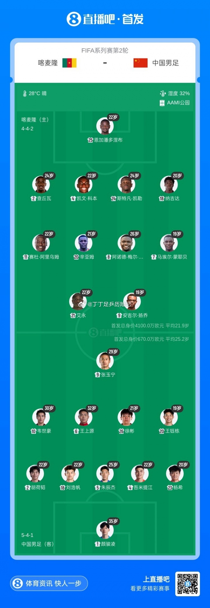 国足vs喀麦隆首发国足vs喀麦隆国足总身价对比:1.974亿欧 vs 1248万