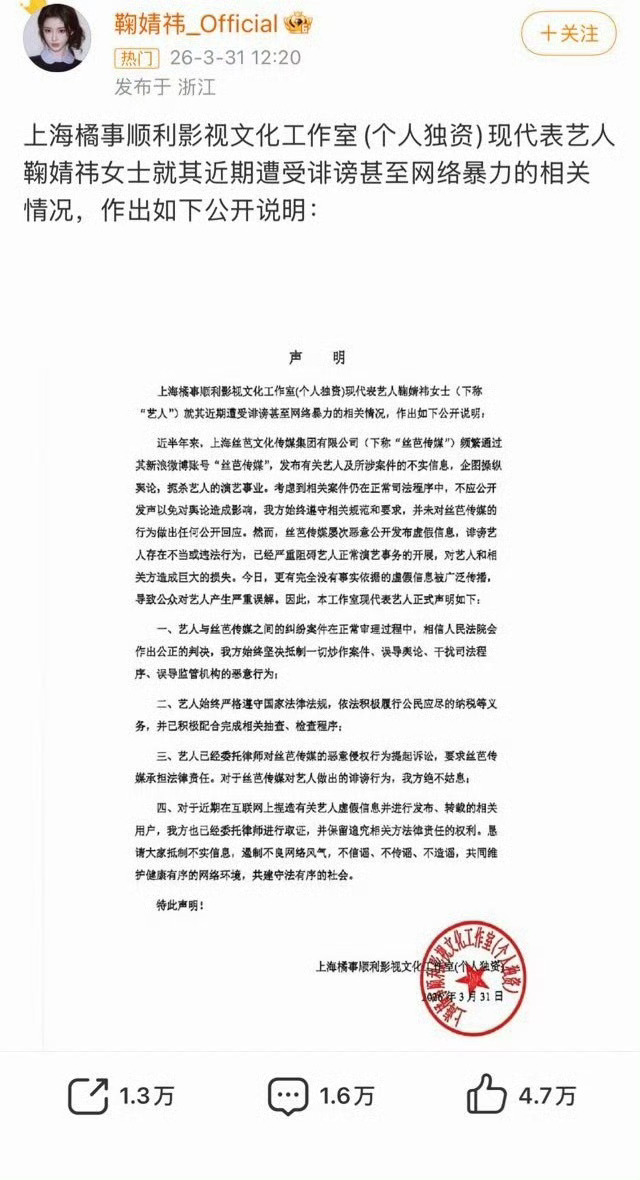 鞠婧祎工作室的号已经没了!鞠婧祎工作室声明鞠婧祎已配合完成税务抽查程序