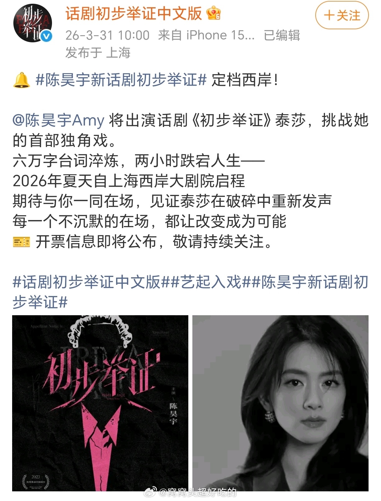 陈昊宇将出演话剧《初步举证》泰莎!小眠将要挑战她的首部独角戏了,太牛了!