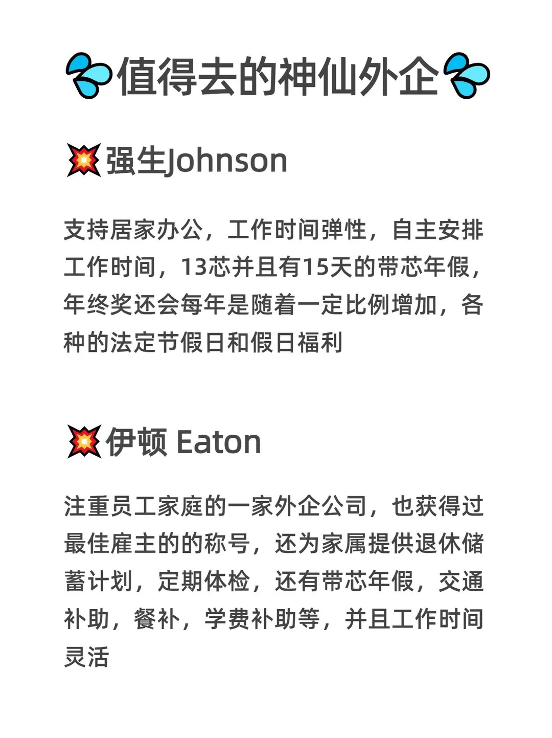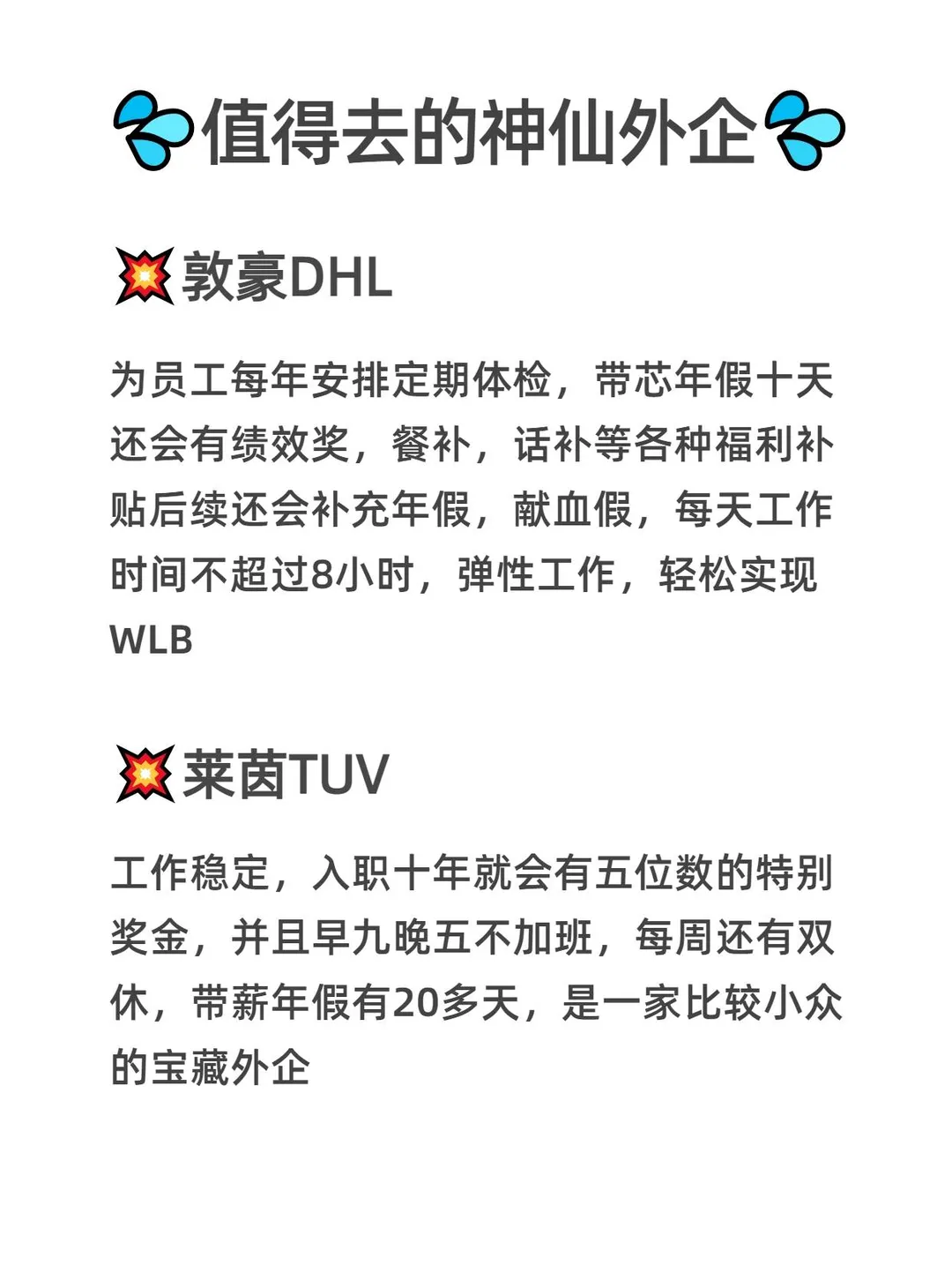 强烈建议正在找工作的宝子试试上海外企![大笑R] ~ ✅在上海外企轻松拿捏工作与生活平衡 ✅对女生超友好,[喝奶茶R]带薪产假、育儿假、陪产假全都有 ✅标准 955不打卡,[微笑R]弹性工作制 + 居家办公 ~ 我整理好了外企的信息表,[色色R]希望帮助宝子们早日拿到心仪的offer~ ~