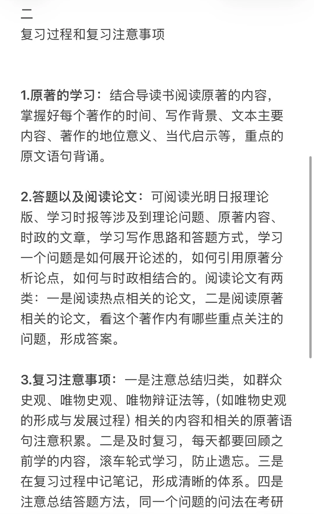 2.答题以及阅读论文:可阅读光明日报理论版、学习时报等涉及到理论问题、原著内容、时政的文章,学习写作思路和答题方式,学习一个问题是如何展开论述的,如何引用原著分析论点,如何与时政相结合的。阅读论文有两类:一是阅读热点相关的论文,二是阅读原著相关的论文,看这个著作内有哪些重点关注的问题,形成答案。