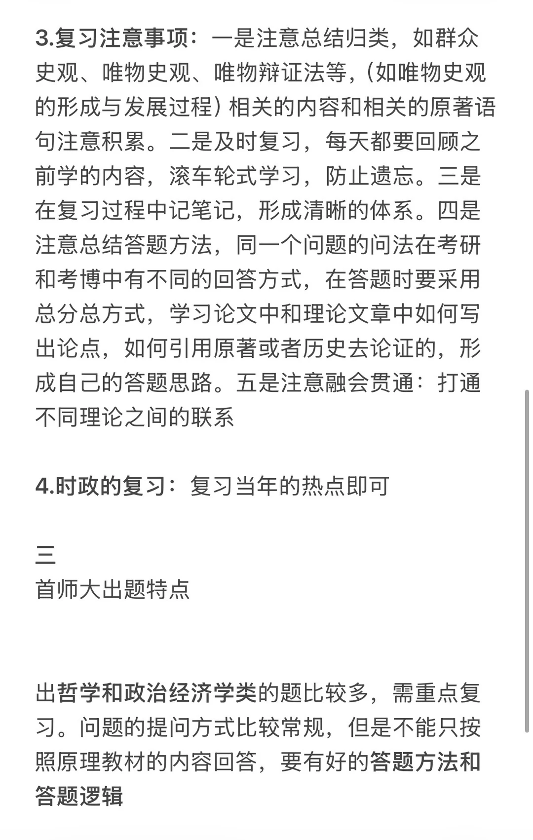3.复习注意事项:一是注意总结归类,如群众史观、唯物史观、唯物辩证法等,(如唯物史观的形成与发展过程)相关的内容和相关的原著语句注意积累。二是及时复习,每天都要回顾之前学的内容,滚车轮式学习,防止遗忘。三是在复习过程中记笔记,形成清晰的体系。四是注意总结答题方法,同一个问题的问法在考研和考博中有不同的回答方式,在答题时要采用总分总方式,学习论文中和理论文章中如何写出论点,如何引用原著或者历史去论证的,形成自己的答题思路。五是注意融会贯通:打通不同理论之间的联系