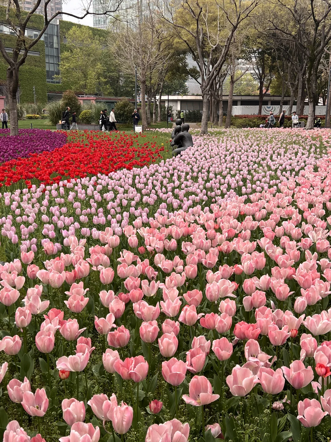 静安雕塑公园的郁金香惊艳到我了! 开炸花的🌷每朵都好大只 「神秘罗马」像油画里出来的一样 好喜欢🥰 还有可爱的小猫咪🐈猛猛干饭 1号口的樱花🌸掉的稀稀拉拉的 垂丝海棠开的很旺 公园里没太多逛的花花 周边逛完还可以去「南京西路」逛逛