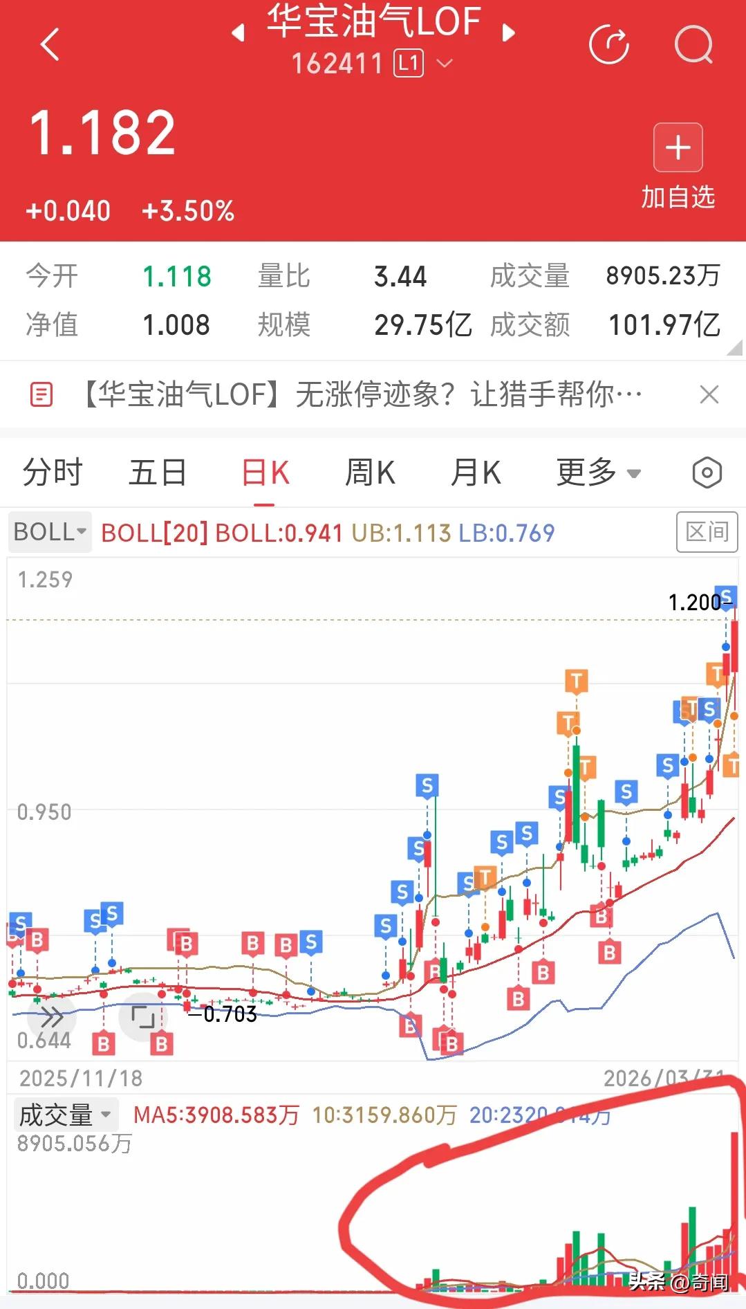 油气ETF市场疯狂交易,华宝油气ETF29亿的规模,成交额超过100亿,这个T+0的场内ETF成为近期A股市场的明星,热度超过很多万亿市值的大盘股。 为何平时成交额不到一亿的ETF突然火热,主要原因是近期国际油气价格上涨,同时国内多个油气ETF溢价超过30%,已经十分危险,因此大量资金涌入了这个平时不够火热的基金。但是目前该ETF溢价已经也超过了15%,存在极大的风险。 国际形势风云突变,油气场内ETF波动十分巨大,相比场外基金溢价太高,建议不要进入炒作,同时石油场外基金也被国家管制,大部分限制每天只能购买10元,或者有些禁止买入,防止市民盲目投资血本无归。 etf板块 华宝油气场内ETF交易额超105亿 国内油气ETF再次火热