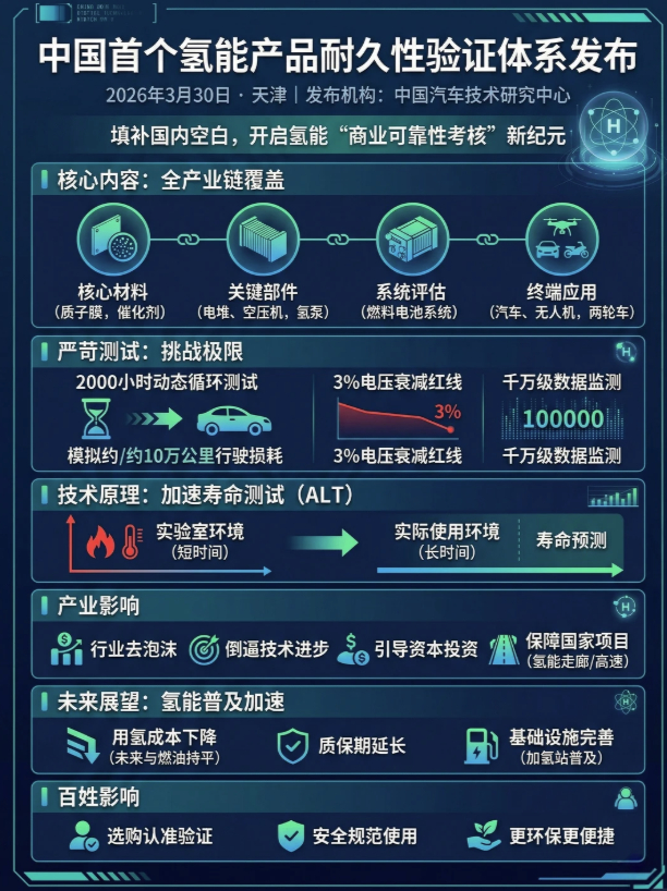 极寒挑战?我国首个氢能产品耐久性验证体系发布!中汽中心开展2000小时动态循环极限测试,高频复现实车工况,验证全产业链可靠性与技术成熟度。新能源汽车