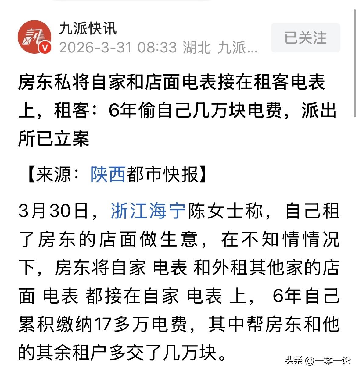 浙江海宁,女子租了一店面做小生意,6年时间缴了17万电费,结果她偶然发现,房东这些年来竟一直把自家电表,以及外租给其他店面的电表,全都接在了她的电表上!女子直接报警,房东虽承认自己是偷了电费,但一分钱都不肯赔,还威胁女子,想继续谈就先撤案。 6年前,陈女士在海宁找了个临街店面做生意,签合同的时候没多想,电费这块就按房东说的,直接从自家电表走数,每月按时缴费。 这6年里,生意起起落落,电费账单也跟着时高时低,她只当是生意好坏带来的用电波动,从没往别处想。 直到上个月,店里电器出了故障,请电工上门维修,才意外发现了猫腻。 电工拆开电表箱一查,发现陈女士店里的电表进线,居然跟房东自家的电表、还有另外两家租户的电表连在了一起。 也就是说,这6年来,陈女士不仅在交自己店里的电费,还默默承担了房东家跟另外两家租户的部分用电。 陈女士赶紧翻出这6年的缴费记录一算,头都大了。 6年下来她总共交了17万多电费,粗略估计,帮别人多交的钱至少有好几万。 这事儿搁谁身上都接受不了,陈女士当天就去找房东对质。 一开始房东还嘴硬,说陈女士看错了,可等陈女士拿出电工的检查记录和缴费单,房东终于松了口,承认是自己接错了电表,但就是不肯提赔偿的事儿,只含糊其辞地说“以后会注意”。 见房东这态度,陈女士气不打一处来,第二天就报了警。 派出所很快立了案,民警调查后,认定房东的行为涉嫌盗窃,把他传唤到了派出所。 没过几天,陈女士接到民警通知,说房东已经办理了取保候审。 本以为事情有了进展,可房东接下来的操作,让陈女士开了眼。 房东主动找了陈女士,但没说半句道歉和赔偿的话,反而撂下话:要么陈女士马上撤案,以后的事儿慢慢谈,要么等租约到期就立马搬走,赔偿想都别想。 这明摆着就是威胁,陈女士当然不肯答应,双方就这么僵住了。 这些天,陈女士一边忙着跑派出所跟进案件,一边还要顾着店里的生意,整个人瘦了一圈。 她觉得,这哪是接错电表,分明是故意的,6年了怎么可能不知道?房东这是欺负人,占了便宜还这么横! 陈女士也想不通,自己按时交房租、守规矩做生意,从没跟房东红过脸,怎么就遇上这么糟心的事儿。 她算了算,多交的几万块,差不多是自己小半年的利润,就这么打了水漂,实在不甘心。现在她每天最担心的就是案件进度,生怕房东耍什么花招,最后自己落得个竹篮打水一场空。 她也曾找过律师咨询,律师说这种情况,只要证据确凿,胜诉的概率不小,但走法律程序耗时耗力,对做生意的人来说,时间就是金钱。 陈女士犯了难。跟房东耗着,怕影响生意,打官司,又怕拖不起。 陈女士现在就盼着派出所能尽快把案子查清楚,让房东把多收的电费吐出来。哪怕最后真的要打官司,她也准备跟房东耗到底。 其实这个房东也是心存侥幸,觉得租户不会留意电表的事儿,才敢偷偷做手脚。可纸终究包不住火,现在不仅要面临法律的处罚,还要赔上自己的名声,实在是得不偿失。 《刑法》第264条规定:盗窃公私财物,数额较大的,或者多次盗窃、入户盗窃、携带凶器盗窃、扒窃的,处三年以下有期徒刑、拘役或者管制,并处或者单处罚金。 房东故意将自家及其他租户电表接入陈女士电表,6年累计让陈女士多缴数万元电费,属于以秘密手段窃取他人财产的行为,已构成盗窃罪。 房东取保候审不影响案件定性,其要求陈女士撤案再谈赔偿的行为,本质是试图逃避法律制裁。 另外房东作为出租方故意隐瞒用电实情,还违反《民法典》中租赁合同的诚实信用原则,陈女士可在刑事追责同时提起民事诉讼,主张返还多缴电费并索要利息损失。 对于这件事,你怎么看? 欢迎关注@一案一论