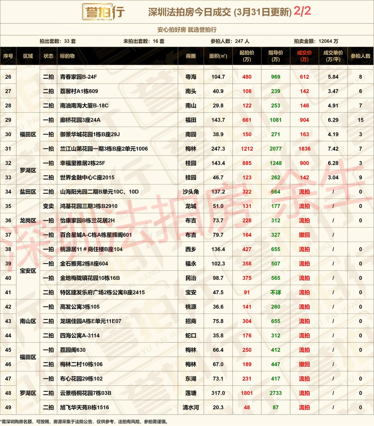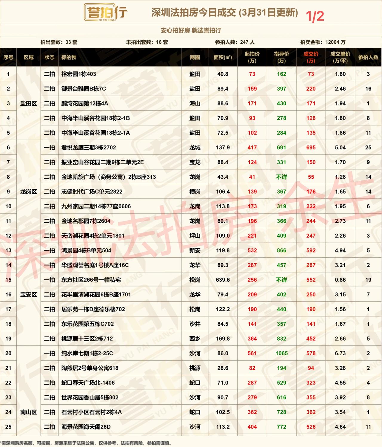 深圳法拍房:3.31成交,好房抢疯了~ 1、今天成交33套,9套参与人数超10人 2、24套二拍成交的有10套超一拍价 3、君悦龙庭25人抢,加价278万,加了67%才拿下 4、松岗私宅19人抢,加价将近300万,加价116%才拿下 5、廊桥花园15人抢,加价37%才拿下