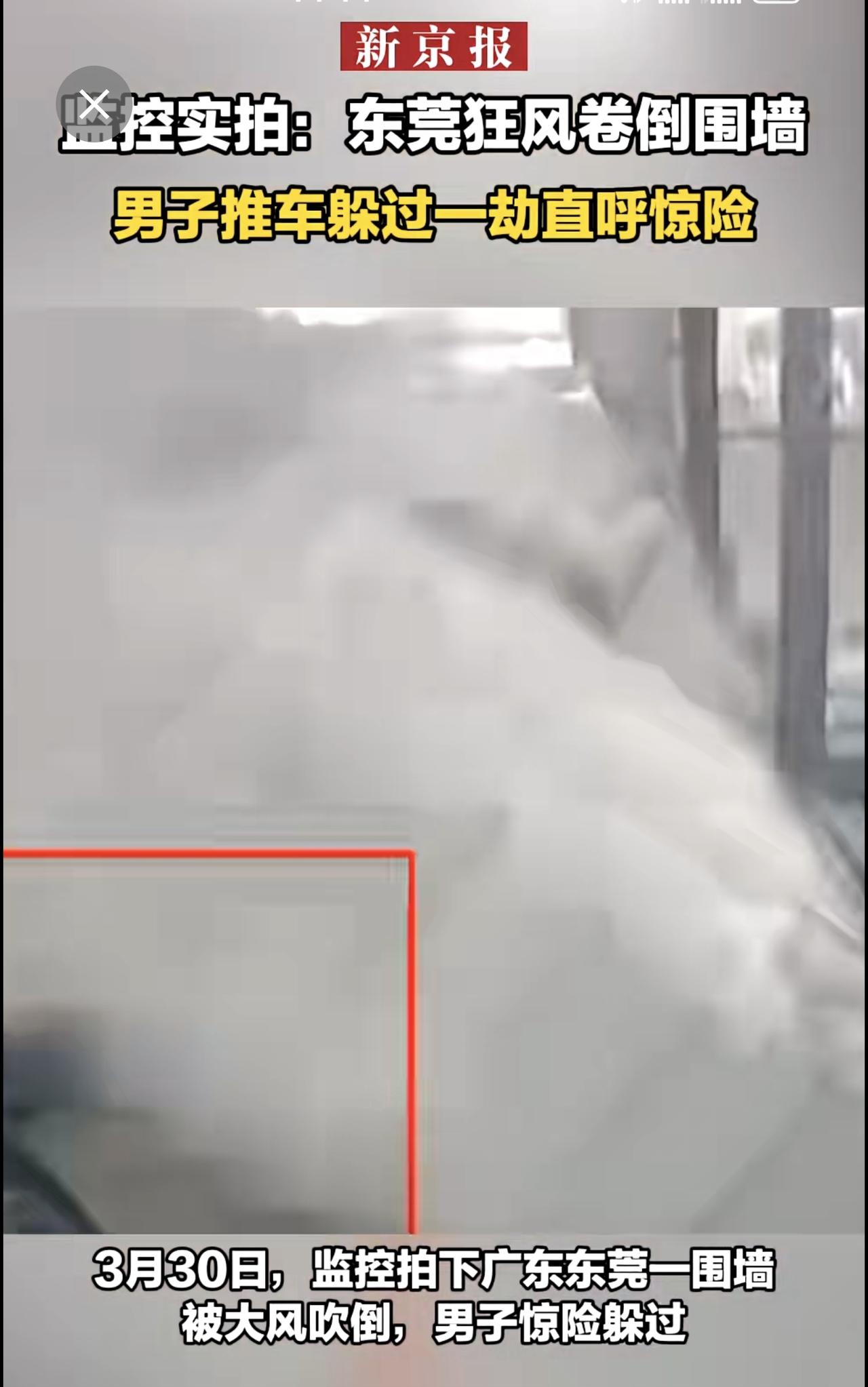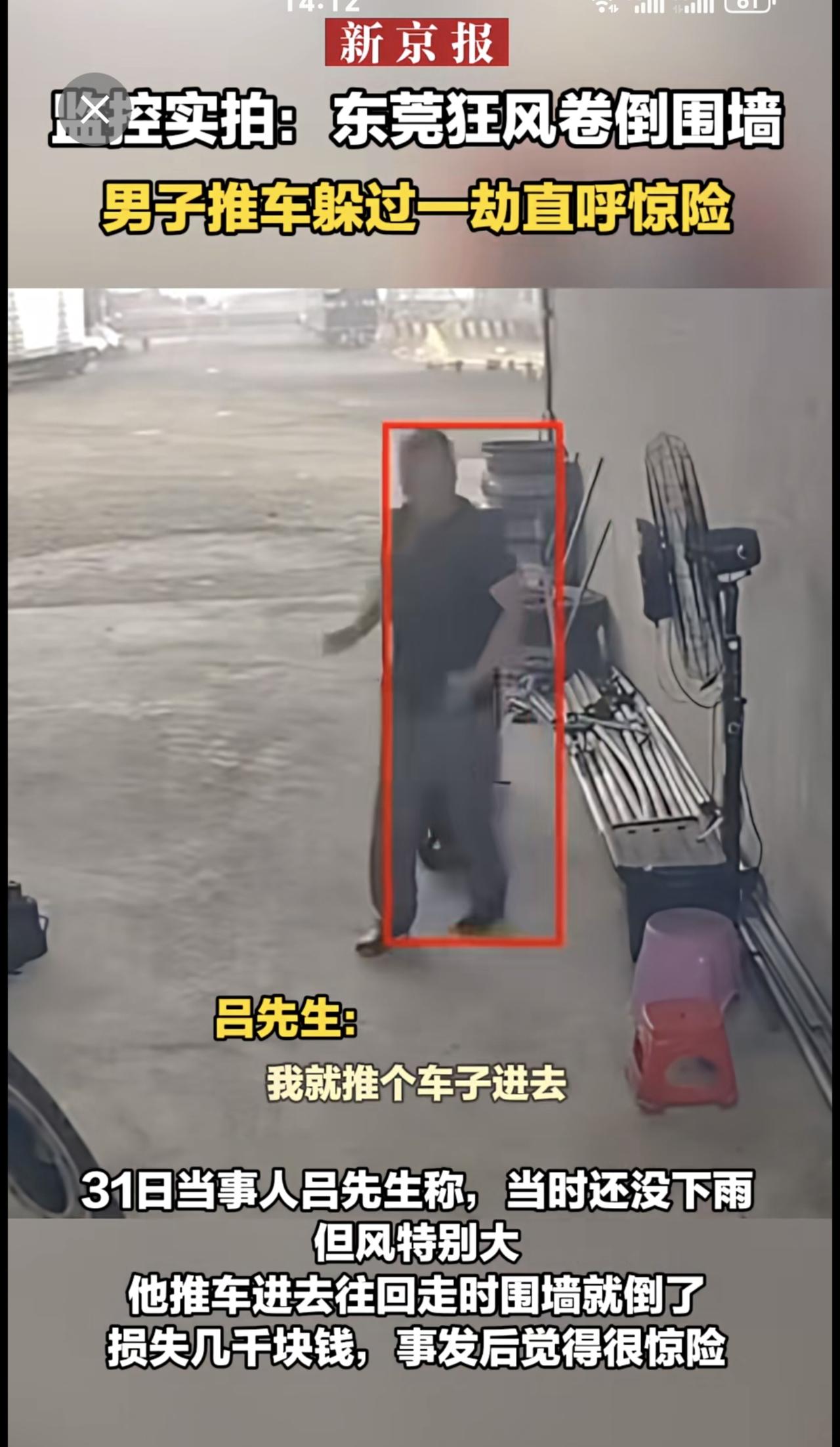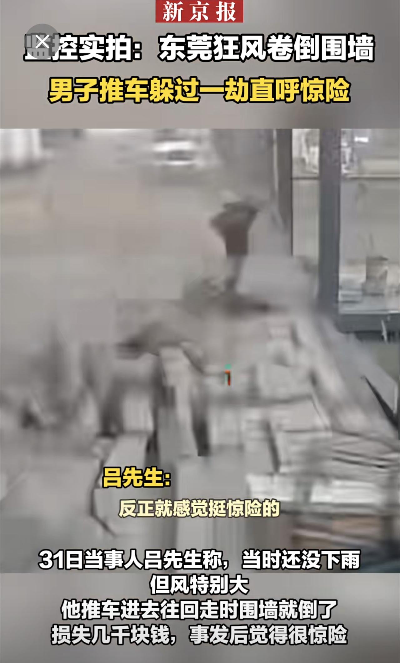 监控实拍:东莞狂风卷倒围墙 男子推车躲过一劫直呼惊险。