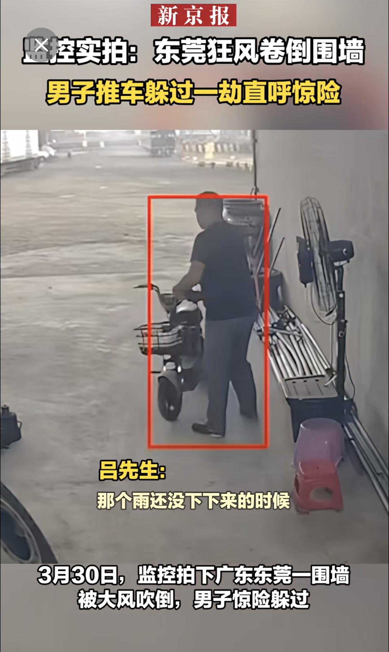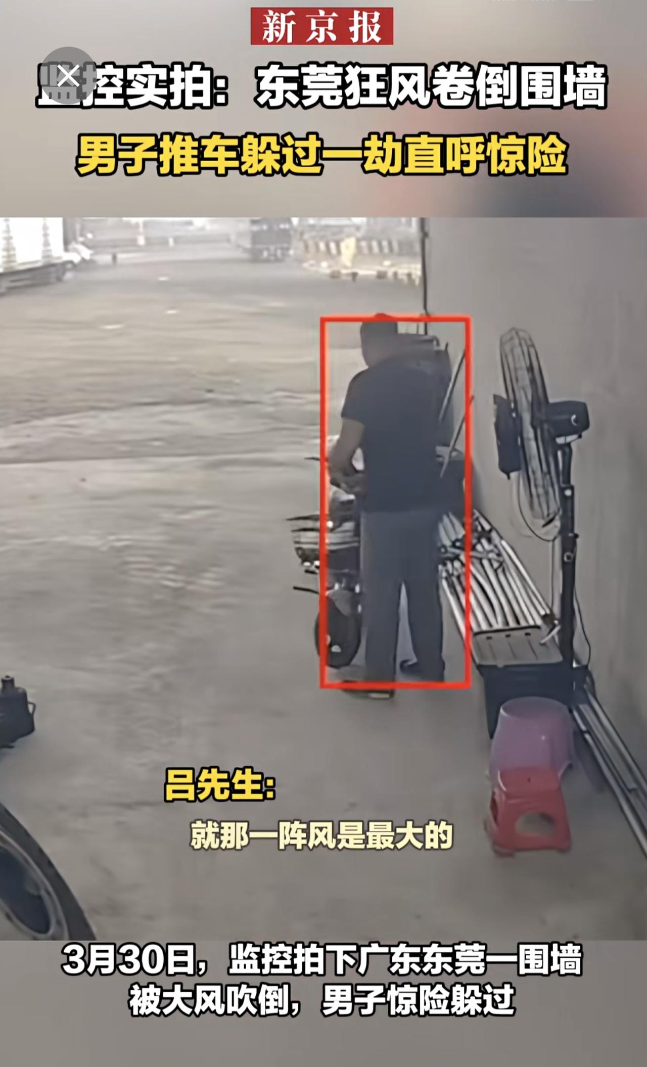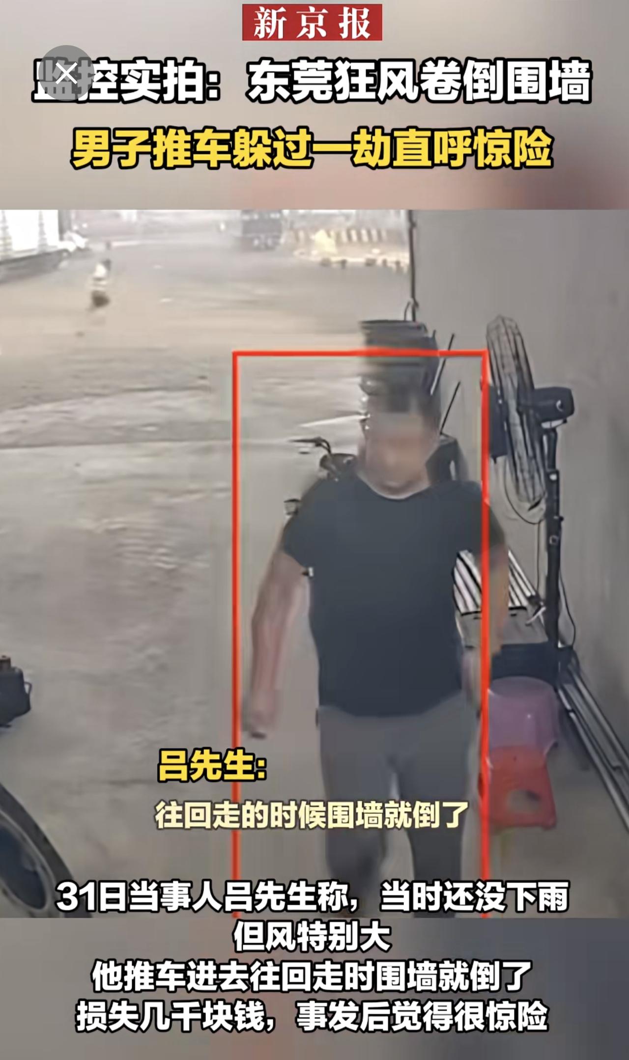 监控实拍:东莞狂风卷倒围墙 男子推车躲过一劫直呼惊险。