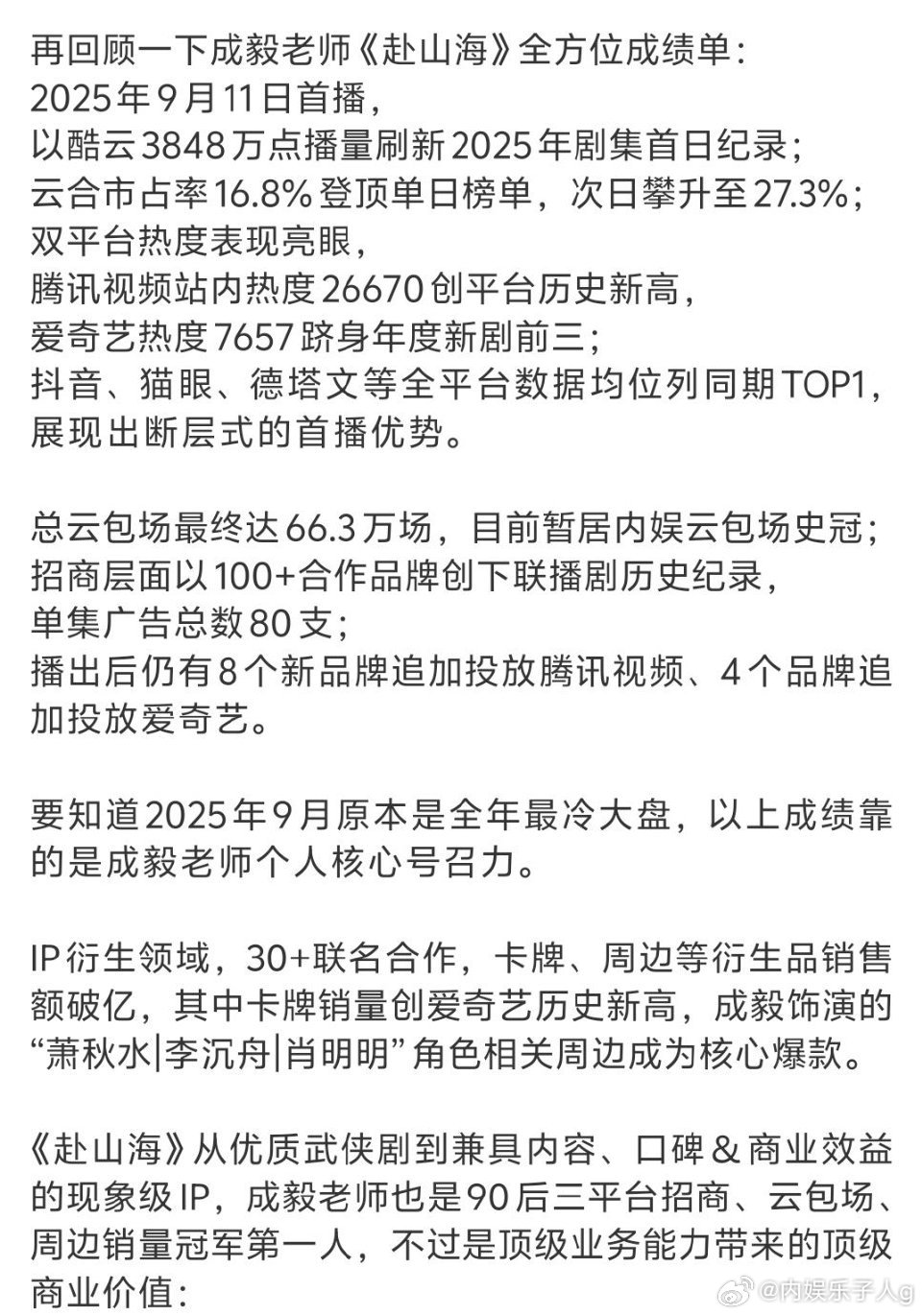 稻草熊财报明确指出《赴山海》热度口碑双丰收…成毅赴山海的成绩还是太权威了…靠一人