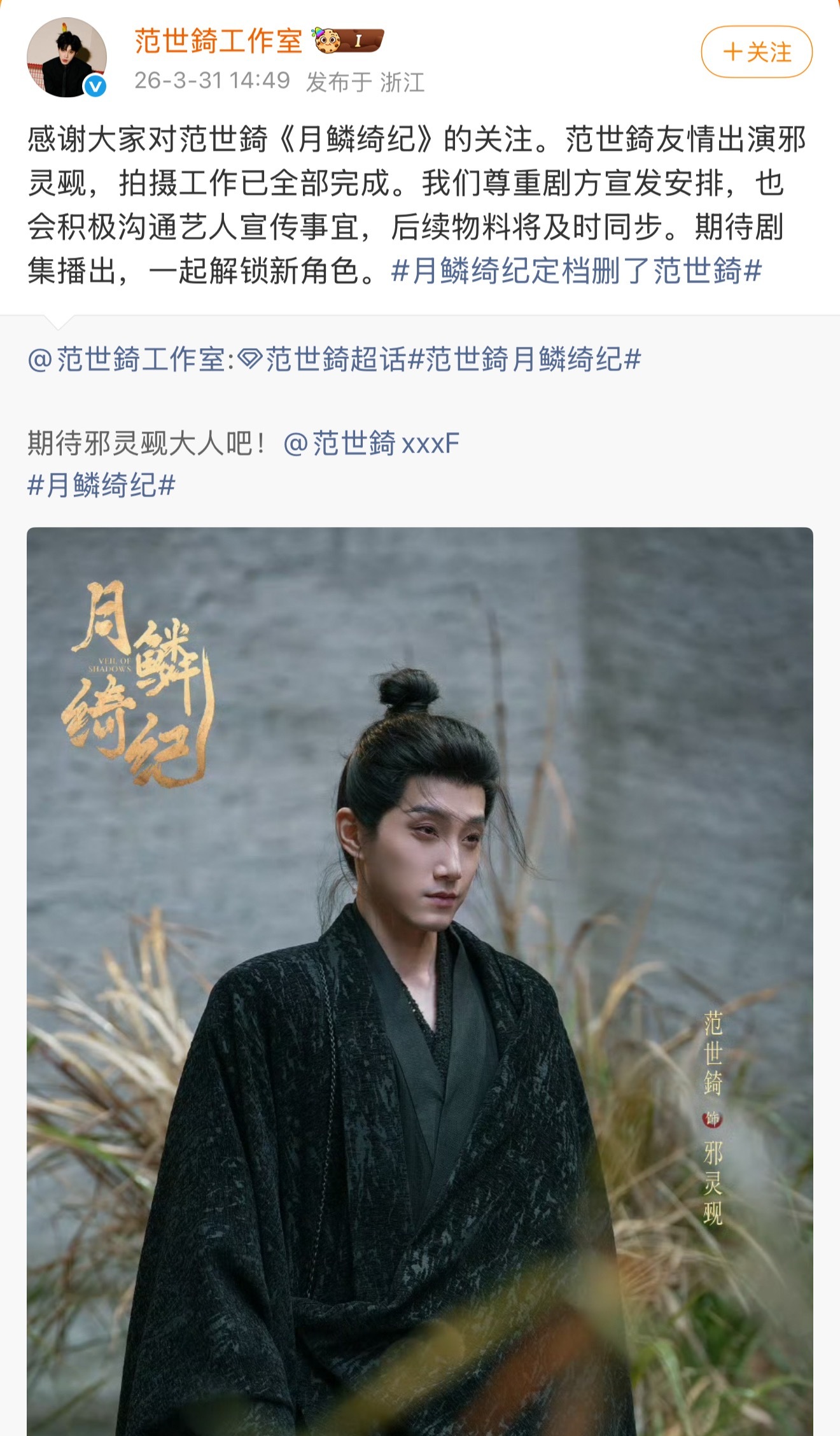 范世錡工作室回应《月鳞绮纪》定档删除范世錡,称尊重剧方宣发安排,也会积极沟通艺人