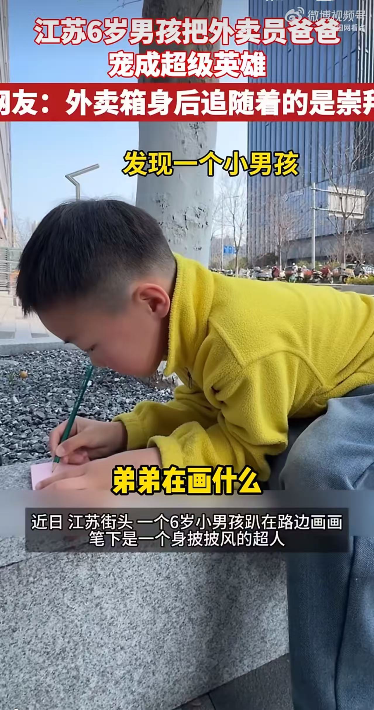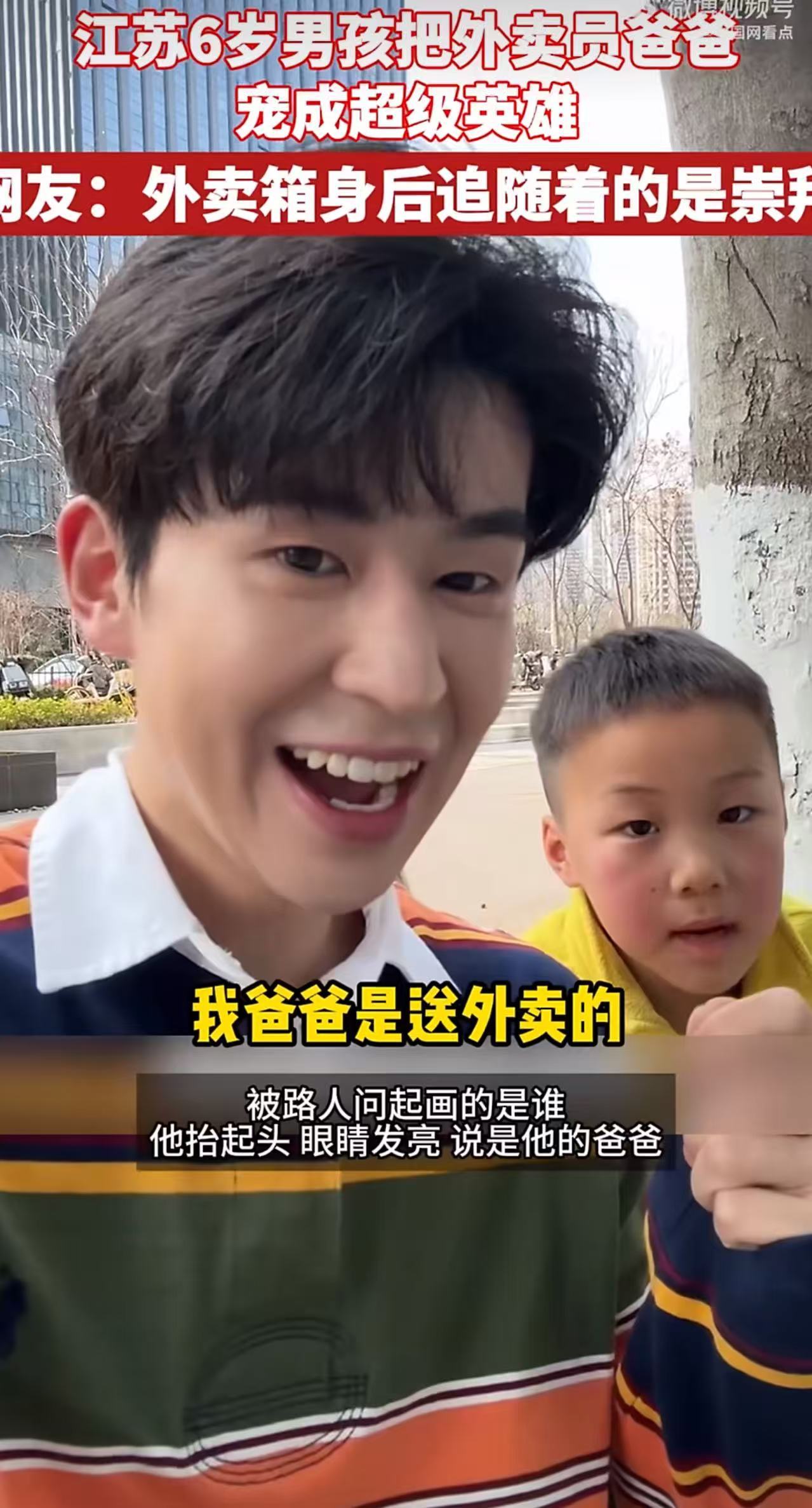 6岁男孩把外卖员爸爸宠成超级英雄“爸爸要有自己的超人style!”一句天真的心愿,让稚嫩的画稿,变成了身上那件耀眼的明黄战衣。外卖箱装着烟火日常,身后追来的,是全世界最纯粹的崇拜与爱意。这对父子的双向奔赴,温柔又治愈,看哭了许多人。真心希望这样的温暖能越来越多:让每一份风雨奔波都被看见,让每一位奔波在路上的“外卖超人”,身后都有小小的身影,默默为他骄傲。江苏男孩说爸爸要有自己的超人style