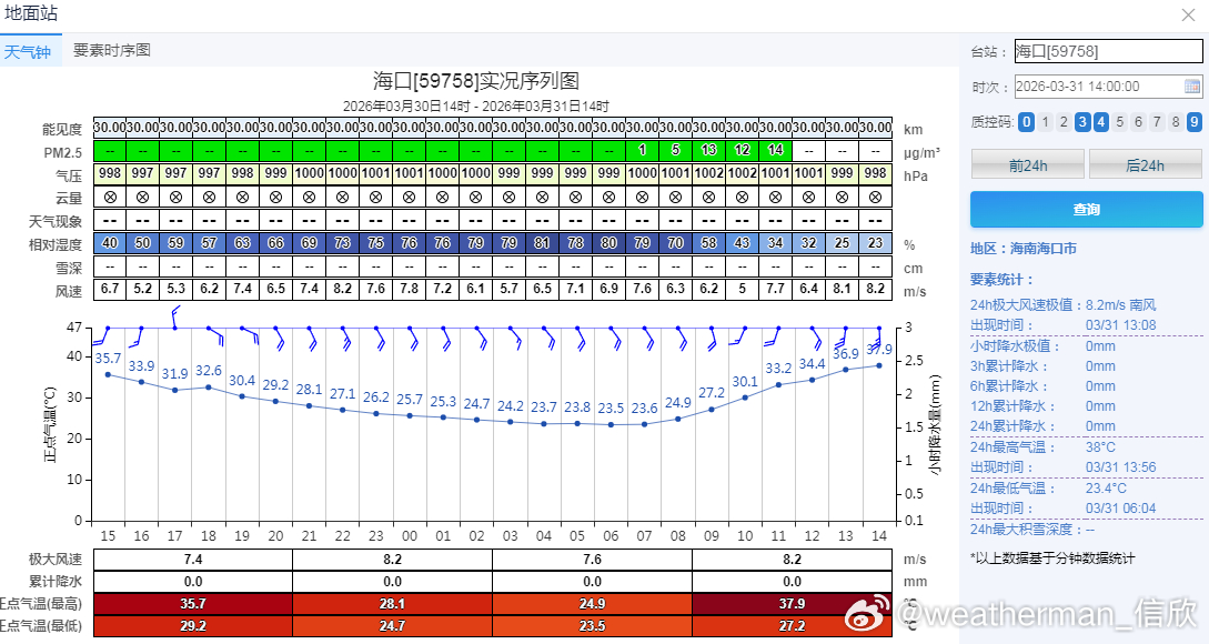 【海南高温】今天截至14时最高,海口38℃,比当地3月最高纪录38.1℃,只差0.1℃。海南临高在13时35分达到了39.1℃,为当地3月第二高的气温(纪录39.3℃),打破当地3月下旬最高纪录。也刷新了今年以来国家气象站的气温新高,为今年首个上39℃的国家气象站。