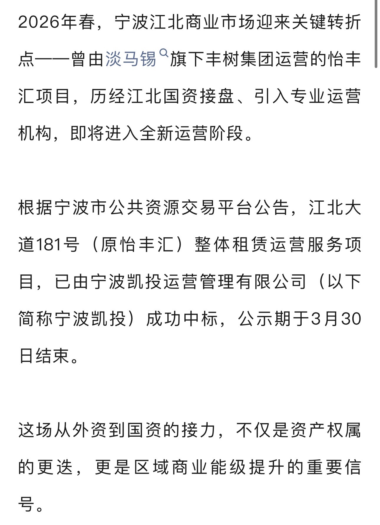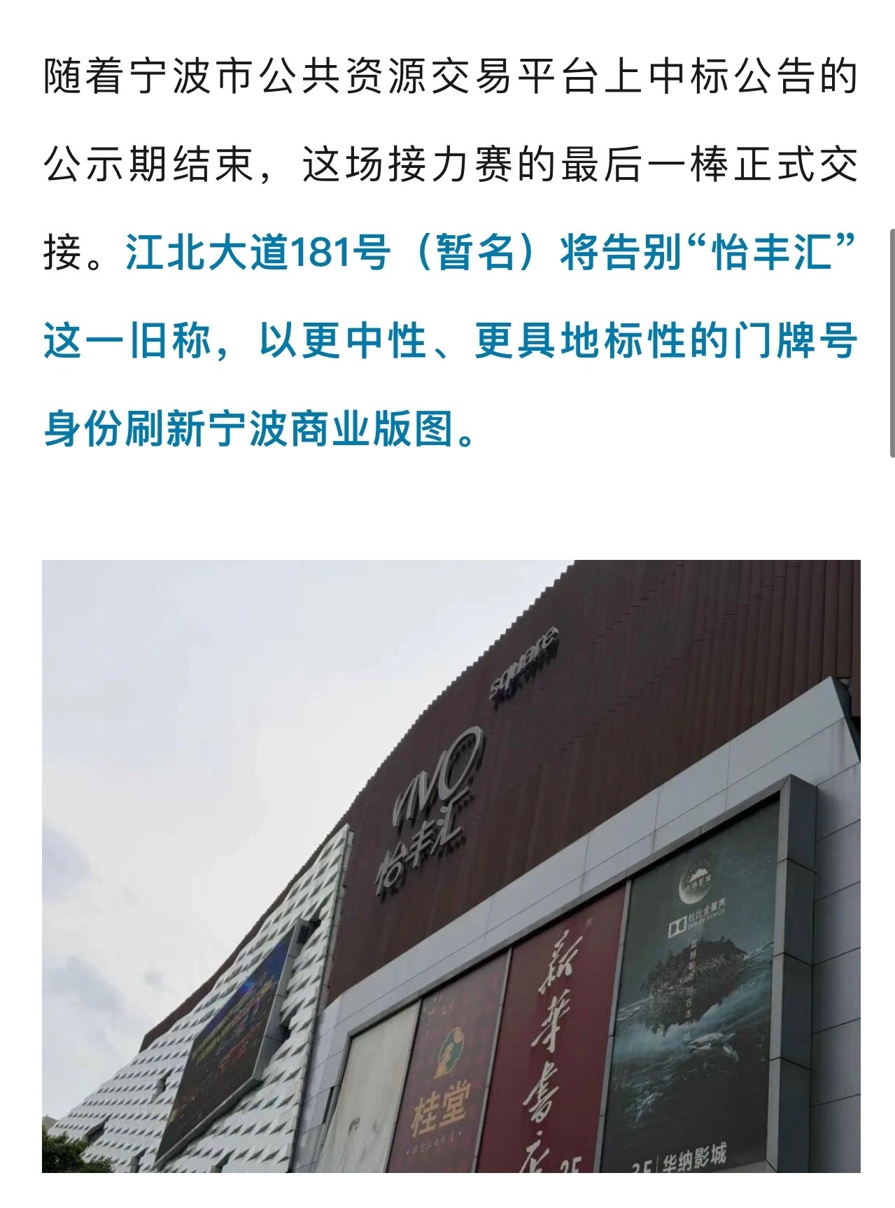 宁波怡丰汇将更名江北大道181号 ,大家觉得这个商场能“活”过来吗?宁波这个商场“易主”了?开业5年多,屡屡被吐槽,最新消息来了!2026年春,宁波江北商业市场迎来关键转折点——曾由淡马锡旗下丰树集团运营的怡丰汇项目,历经江北国资接盘、引入专业运营机构,即将进入全新运营阶段。