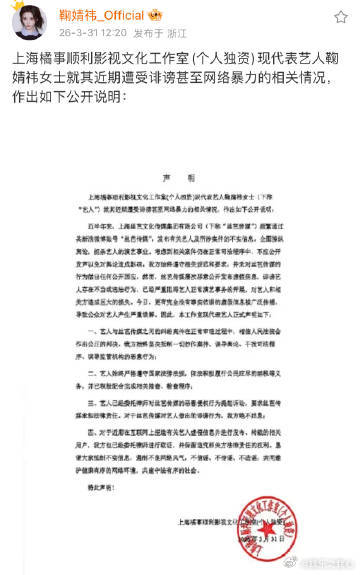 鞠婧祎工作室声明在娱乐圈这个大舞台上,明星们的一举一动都备受关注,稍有风吹草动,各种流言蜚语便会甚嚣尘上。鞠婧祎,这位以甜美形象和精湛演技受到众多粉丝喜爱的艺人,其工作室也时常发布声明来应对各类不实传闻