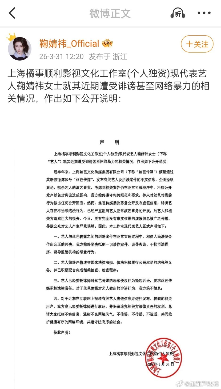 鞠婧祎 收入明细工作室发了声明,又是雷声大雨点小,发律师函呀!报警啊!?鞠婧祎方
